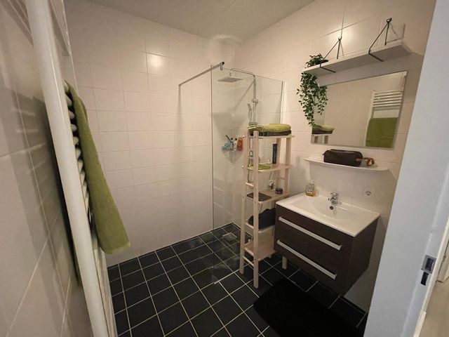 De badkamer is geheel betegeld en is voorzien van een inloopdouche en een wastafel in wastafelmeubel.