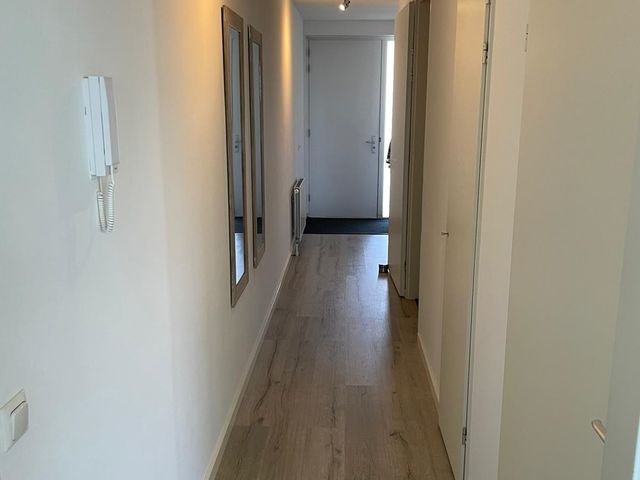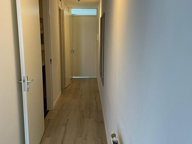 De ruime hal met intercom-videofoon, biedt toegang tot de slaapkamer, badkamer, meterkast, toilet en de woonkamer. De wanden zijn voorzien van stucwerk en de vloer is afgewerkt met laminaat welke doorloopt door het gehele appartement m.u.v. de badkamer.