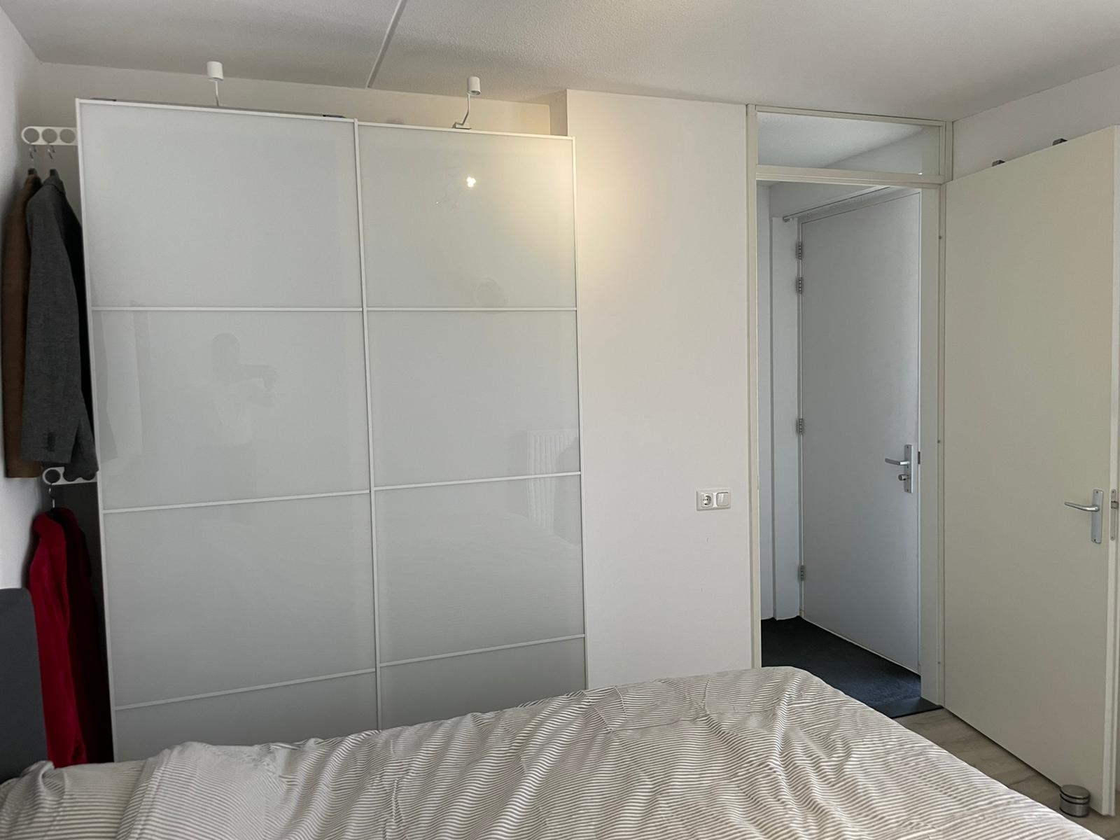 De ruime slaapkamer is voorzien van een laminaatvloer en de wanden zijn gestuct. Vanuit de slaapkamer is er toegang tot een bergkast.