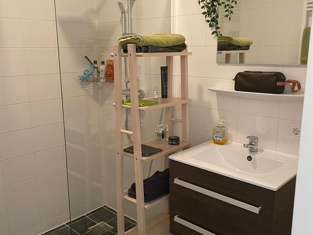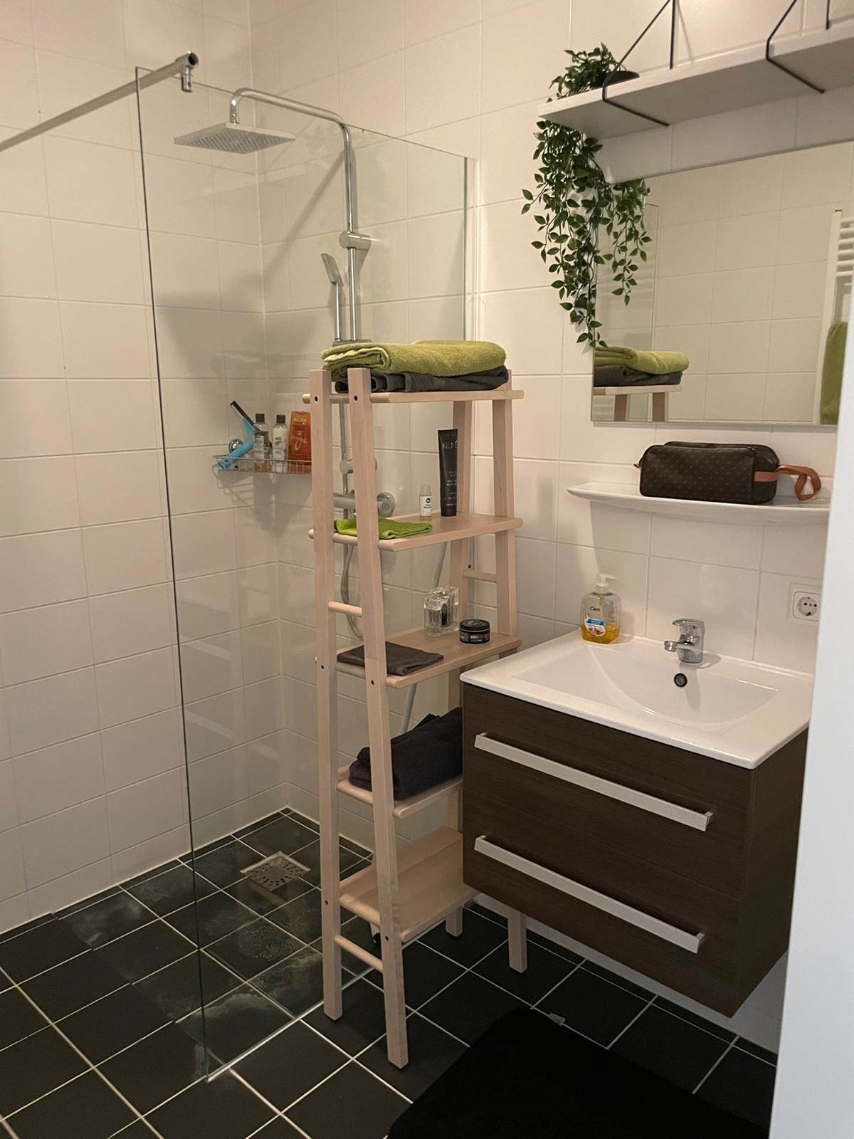 De badkamer is geheel betegeld en is voorzien van een inloopdouche en een wastafel in wastafelmeubel.