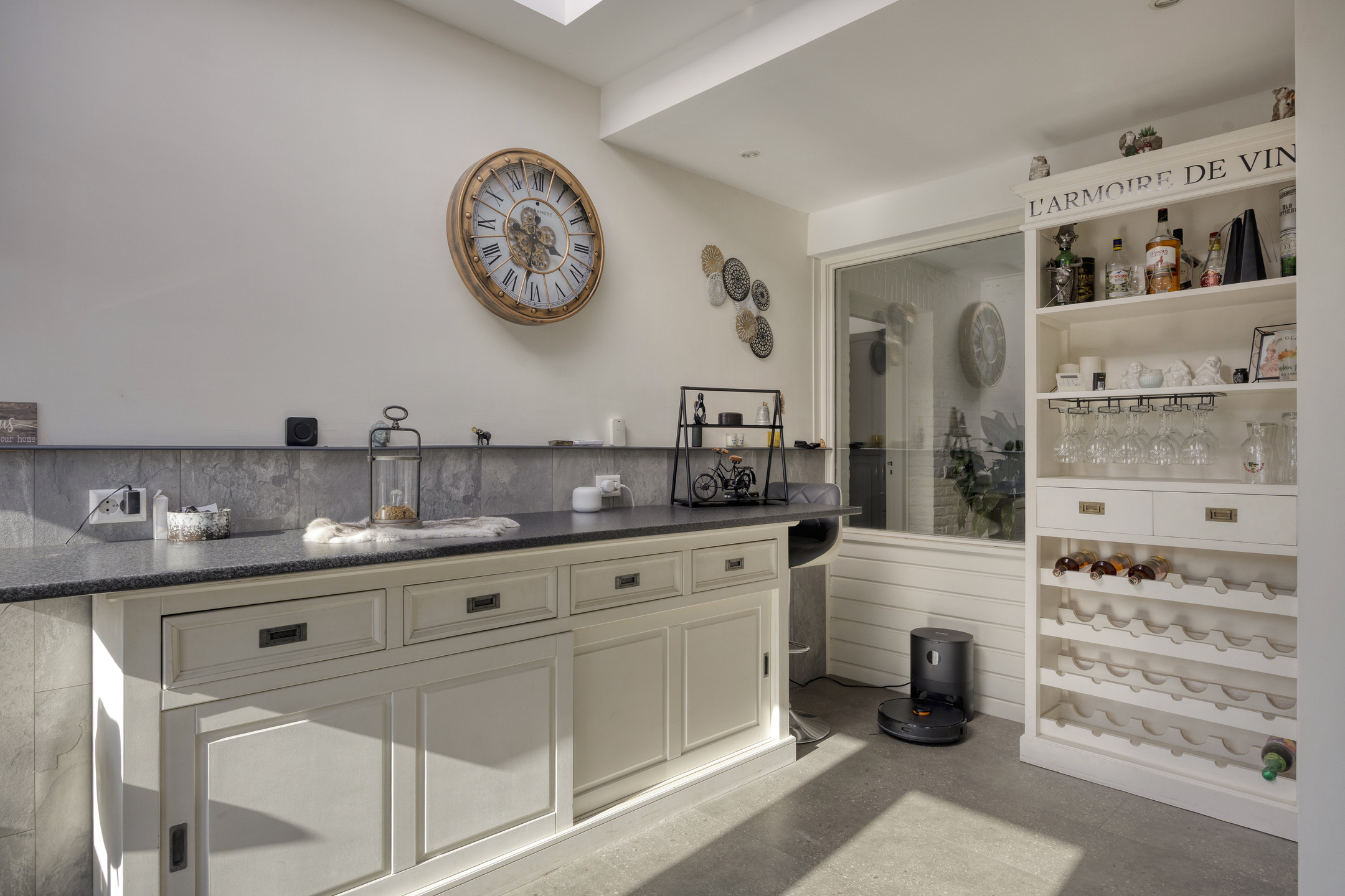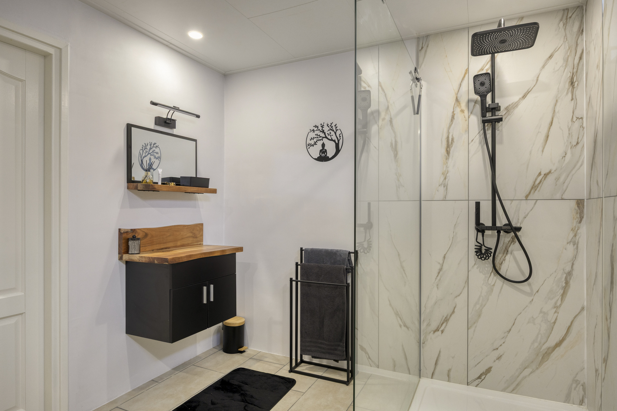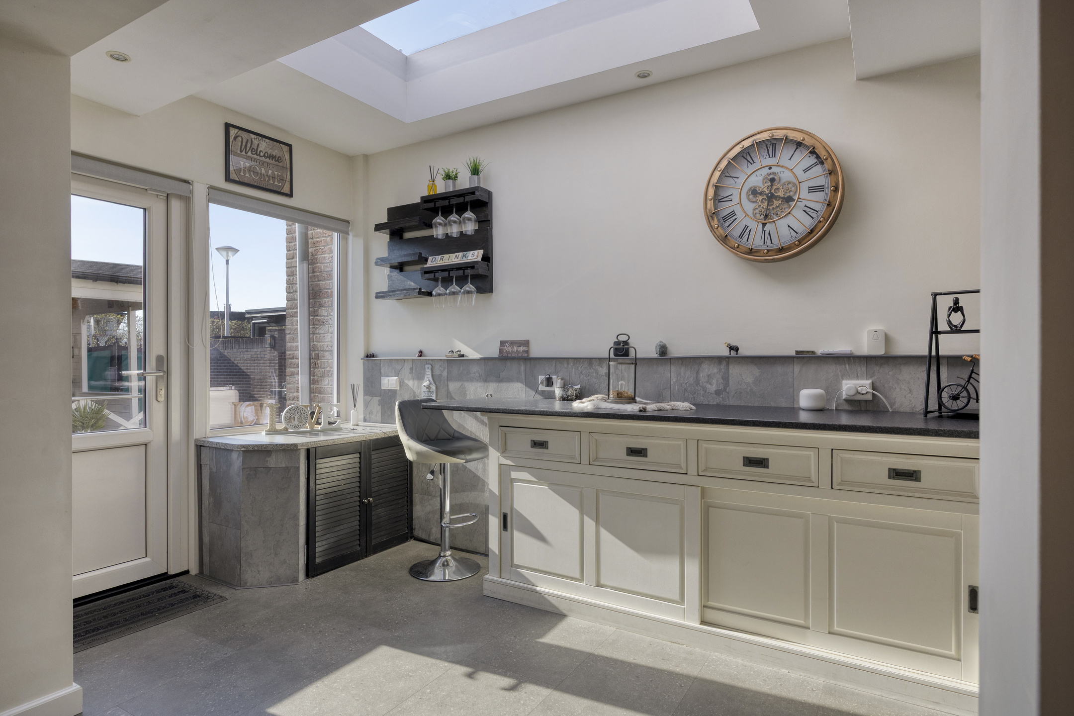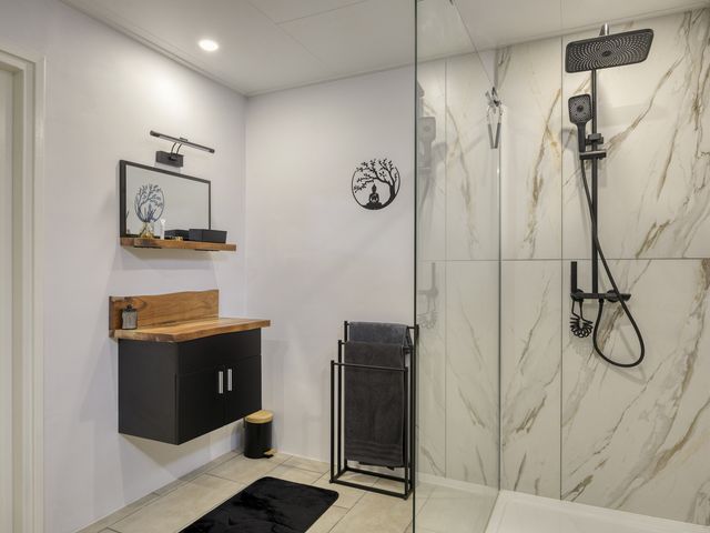 Vanuit de woonkamer zijn de halfopen bijruimte en de tussengang toegankelijk. De semi-open bijruimte heeft een forse lichtkoepel, een speelse glazendoorkijk naar de tussengang en een loopdeur naar de aantrekkelijke zijtuin. Via de tussengang zijn badkamer 1 en de zelfstandige woonunit te bereiken. Badkamer 1, heeft een hoog liggend raam, een designradiator, is voorzien van 2 moderne staande wastafels en een perfecte inloopdouche met gehard glas.