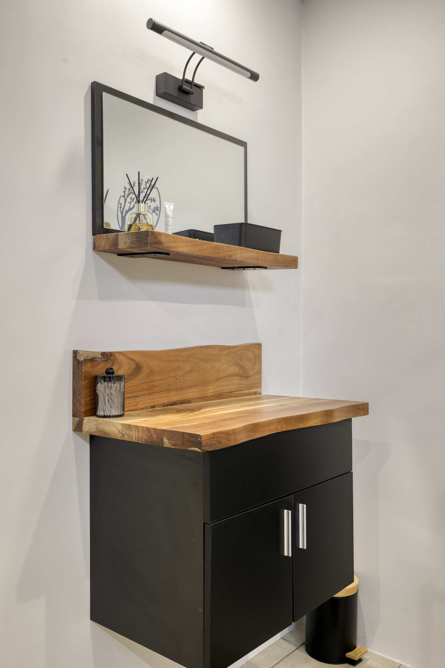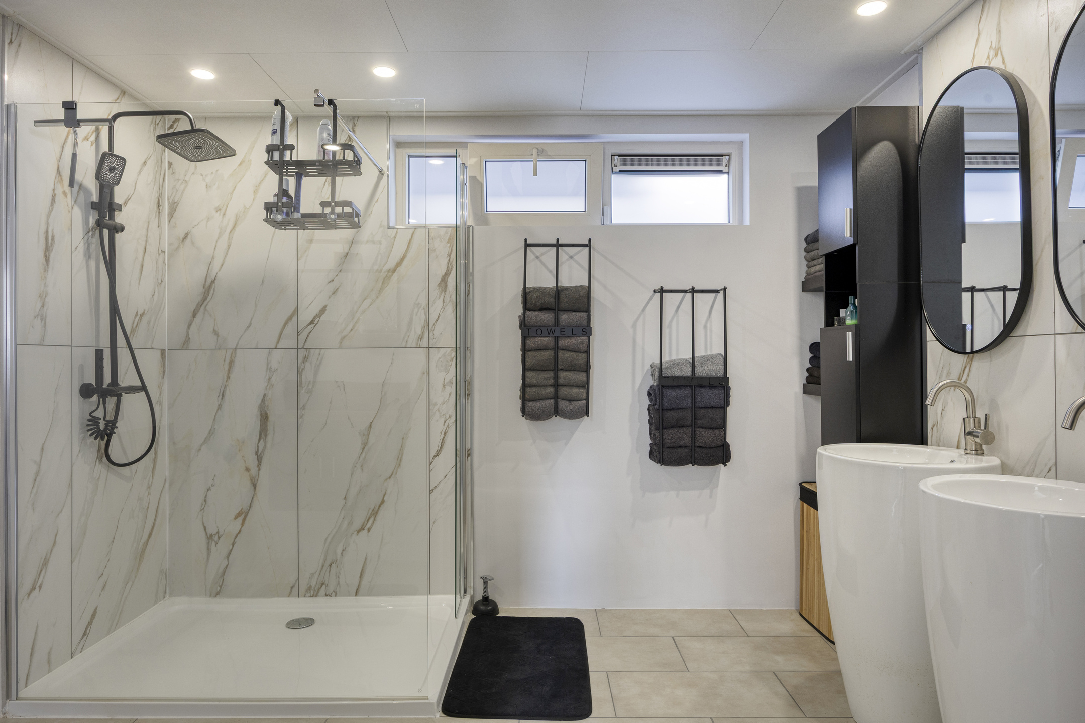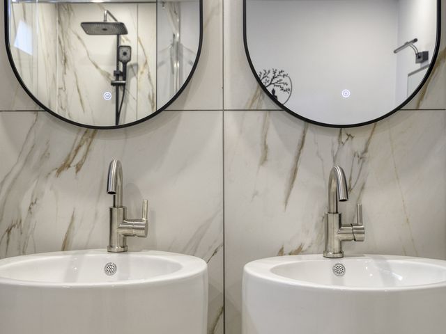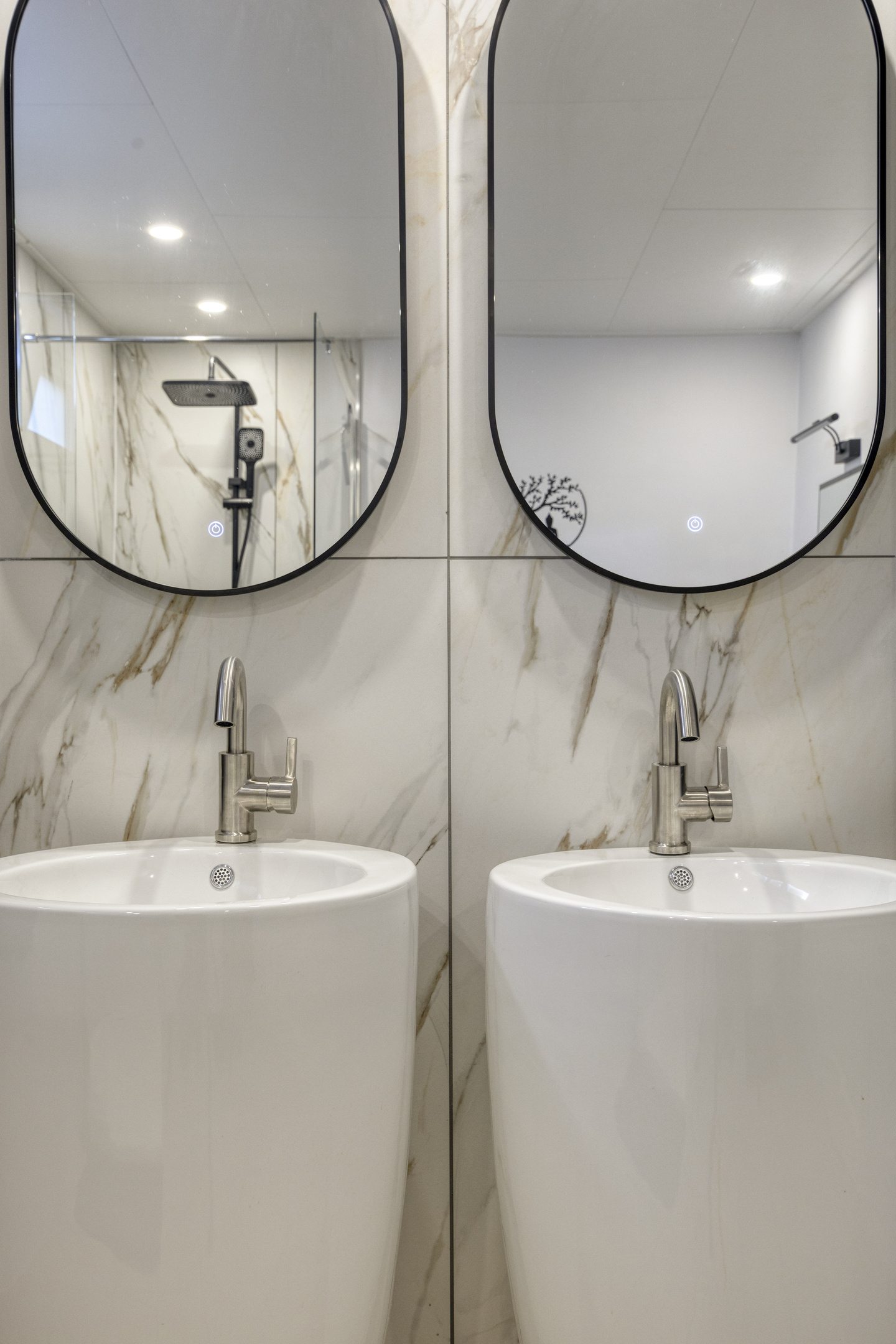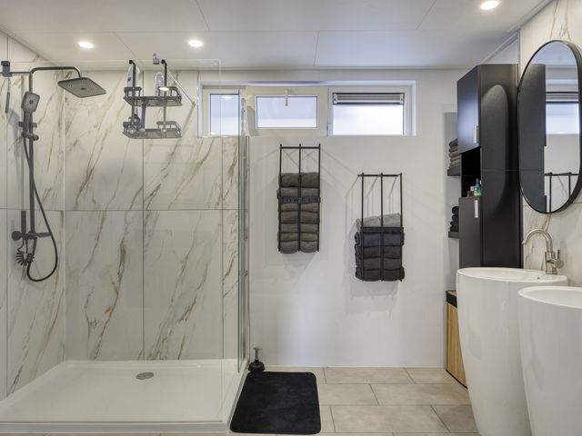 Vanuit de woonkamer zijn de halfopen bijruimte en de tussengang toegankelijk. De semi-open bijruimte heeft een forse lichtkoepel, een speelse glazendoorkijk naar de tussengang en een loopdeur naar de aantrekkelijke zijtuin. Via de tussengang zijn badkamer 1 en de zelfstandige woonunit te bereiken. Badkamer 1, heeft een hoog liggend raam, een designradiator, is voorzien van 2 moderne staande wastafels en een perfecte inloopdouche met gehard glas.