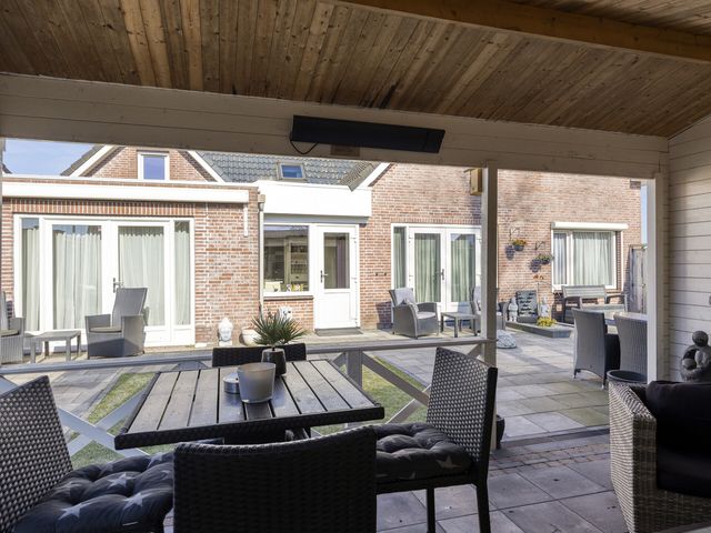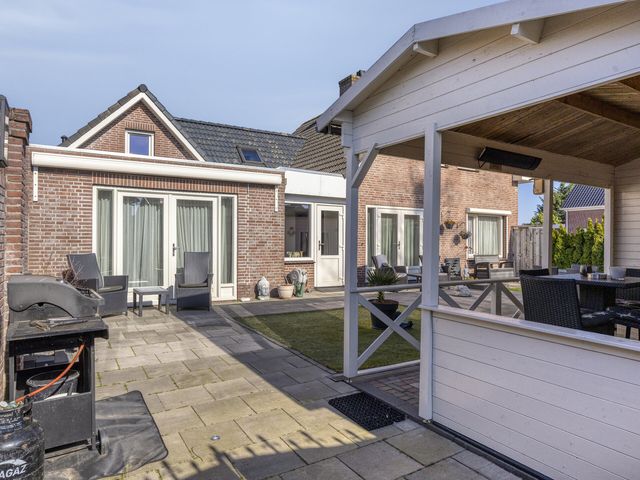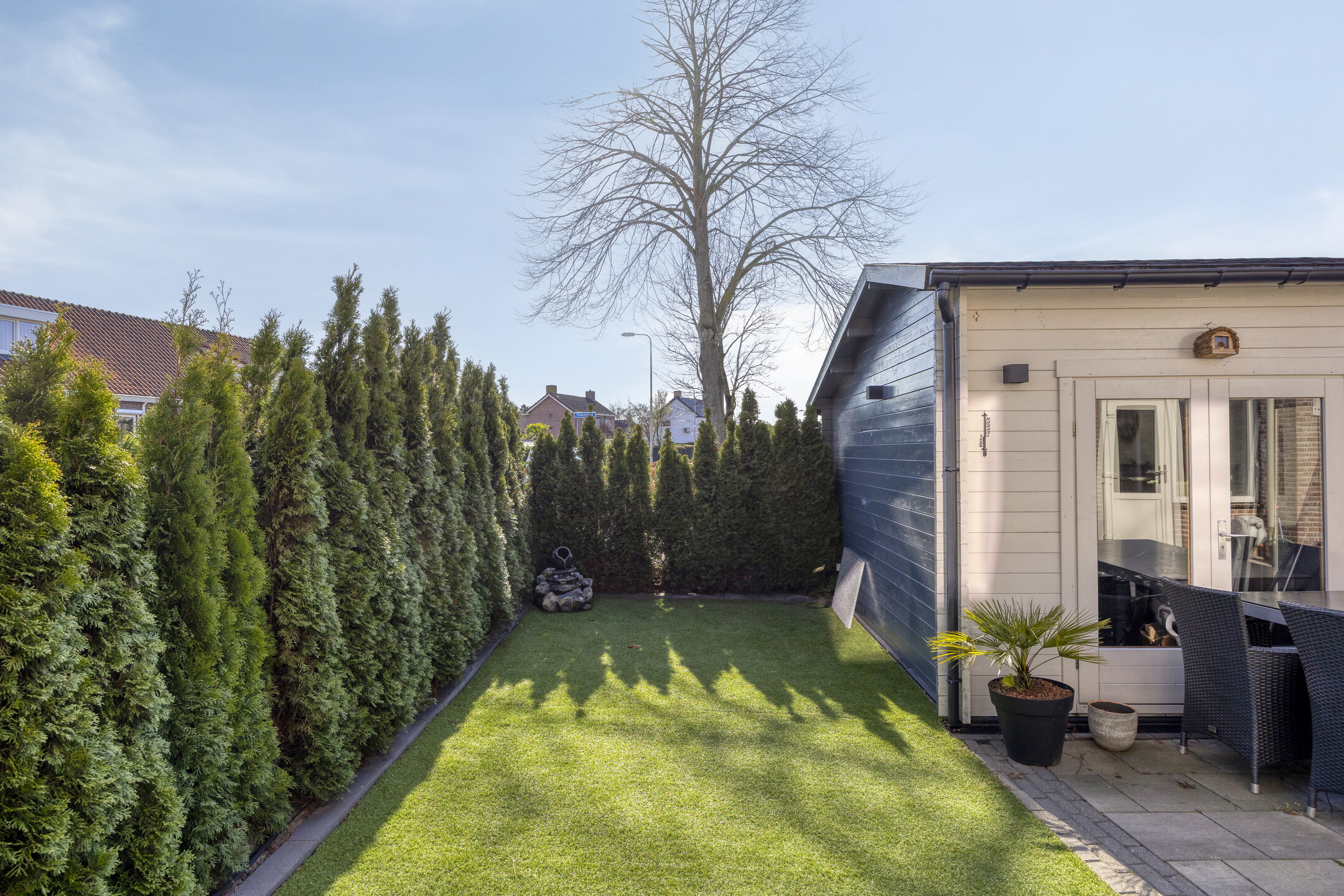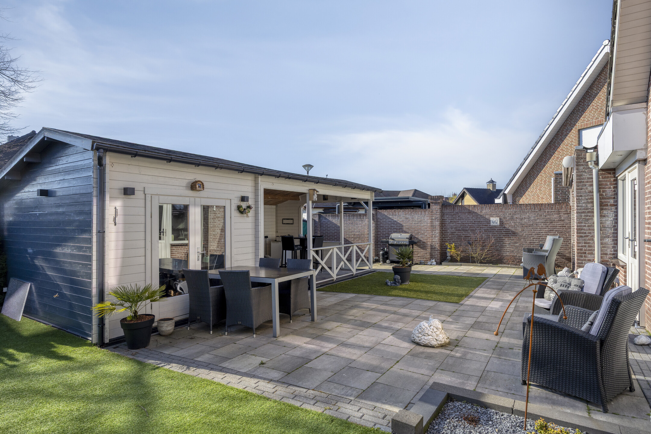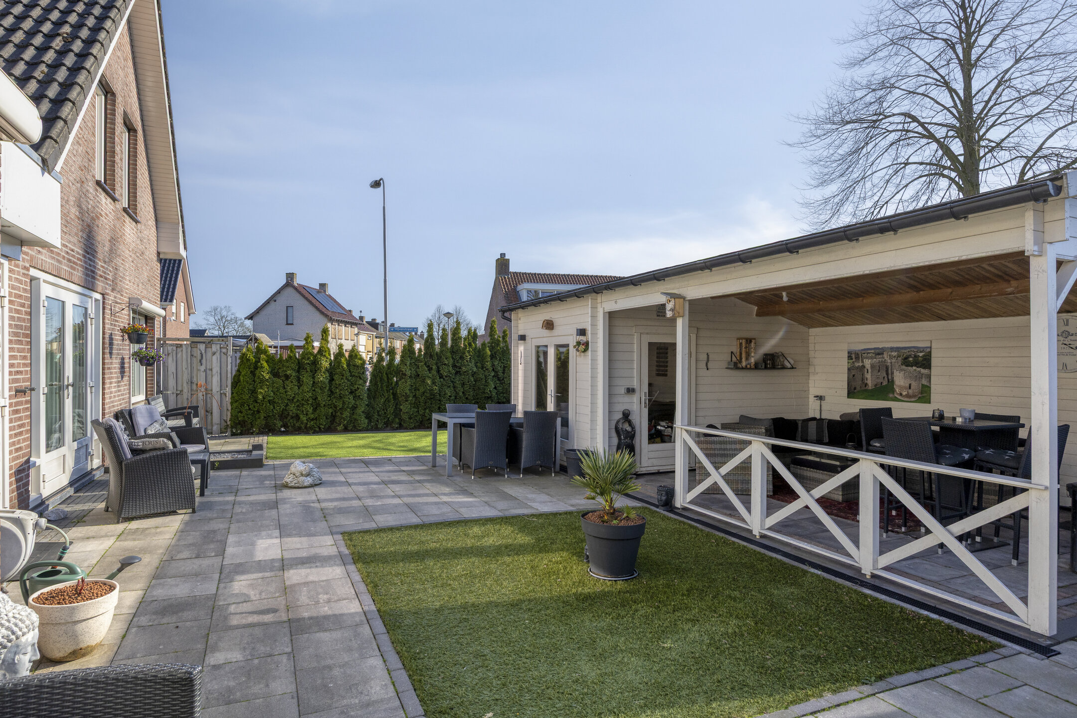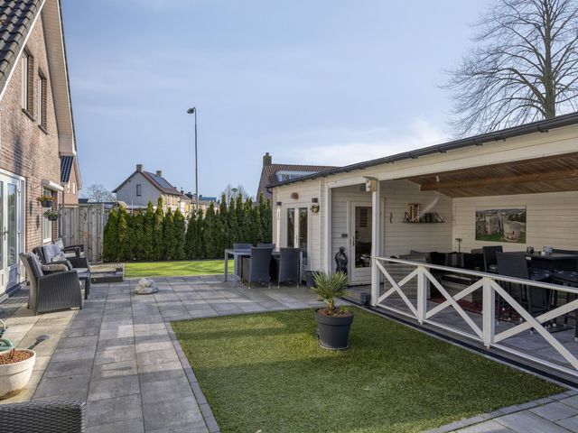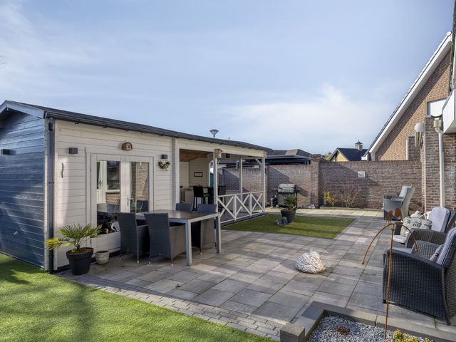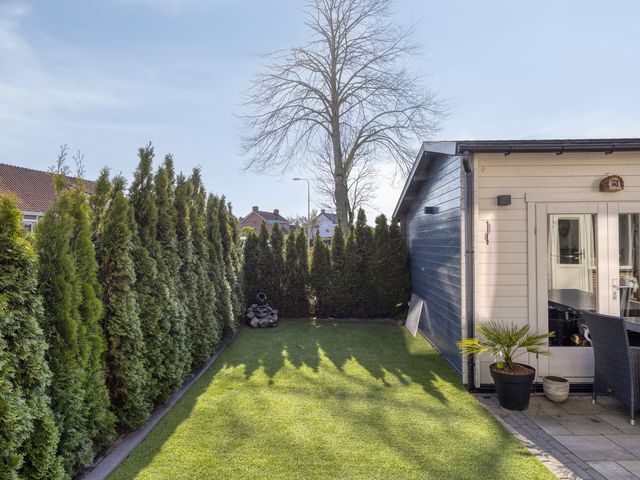 De voor- en zijtuin lopen mooi in elkaar over. De voortuin maakt het straatbeeld mooier en de aantrekkelijke zijtuin ligt ideaal op het zuidwesten. De verrassende royale zijtuin, ca. 9 m diep & ca. 11.50 m, breed heeft 2 zonneterrassen, een zijpoort, een oprit - voor 2 auto's achter elkaar en een fraaie tuinkamer met een aangrenzende berging/hobbyruimte.