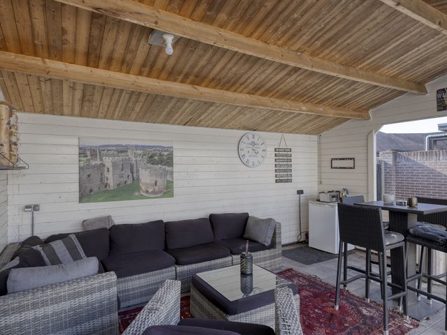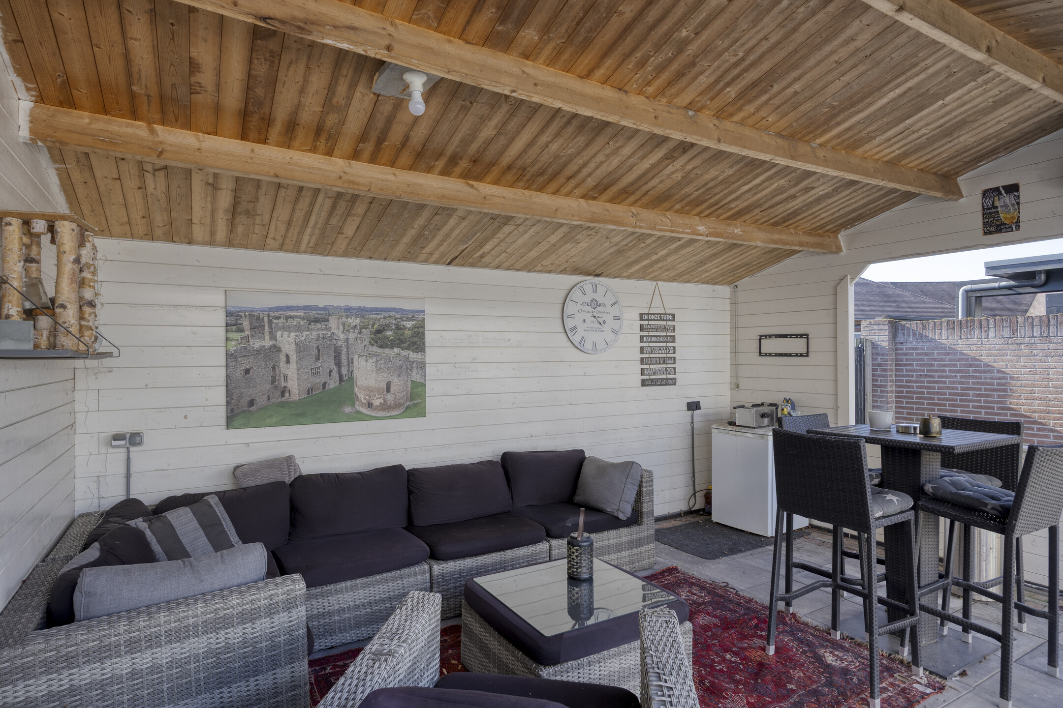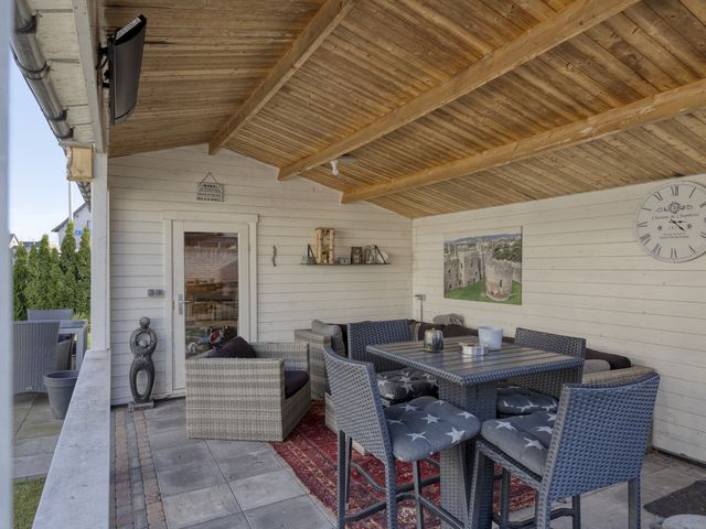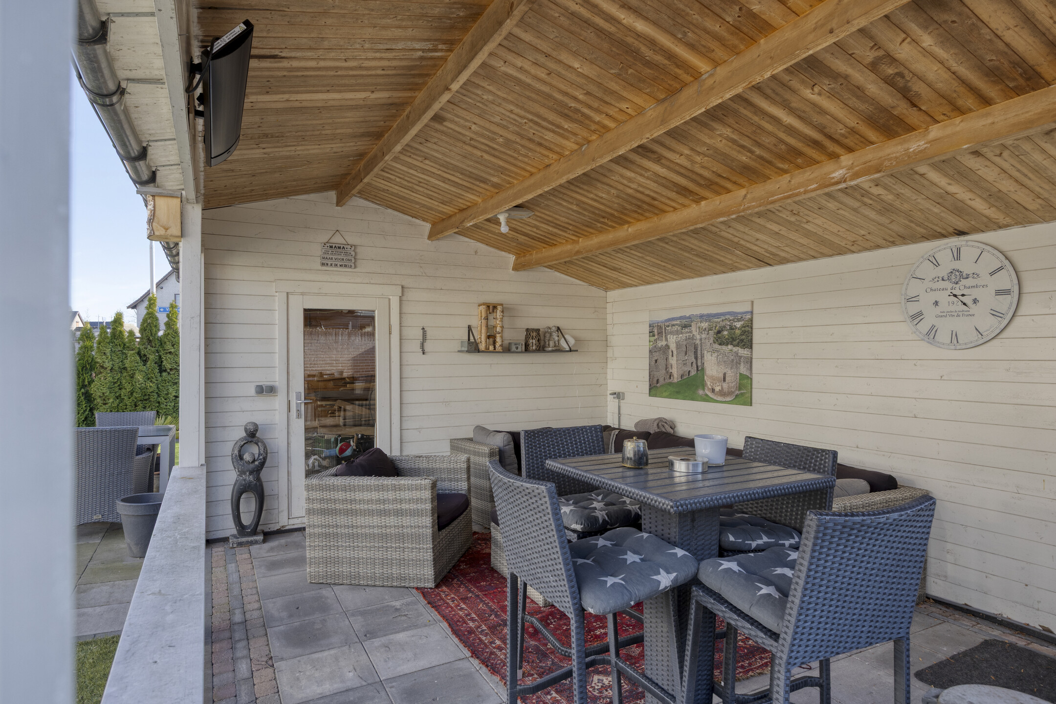 De privacy in de zijtuin is zondermeer goed. Deze tuinkamer met elektra heeft een verbindingsdeur naar de aangrenzende hobby annex bergruimte.