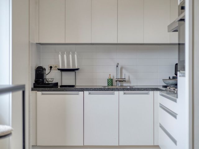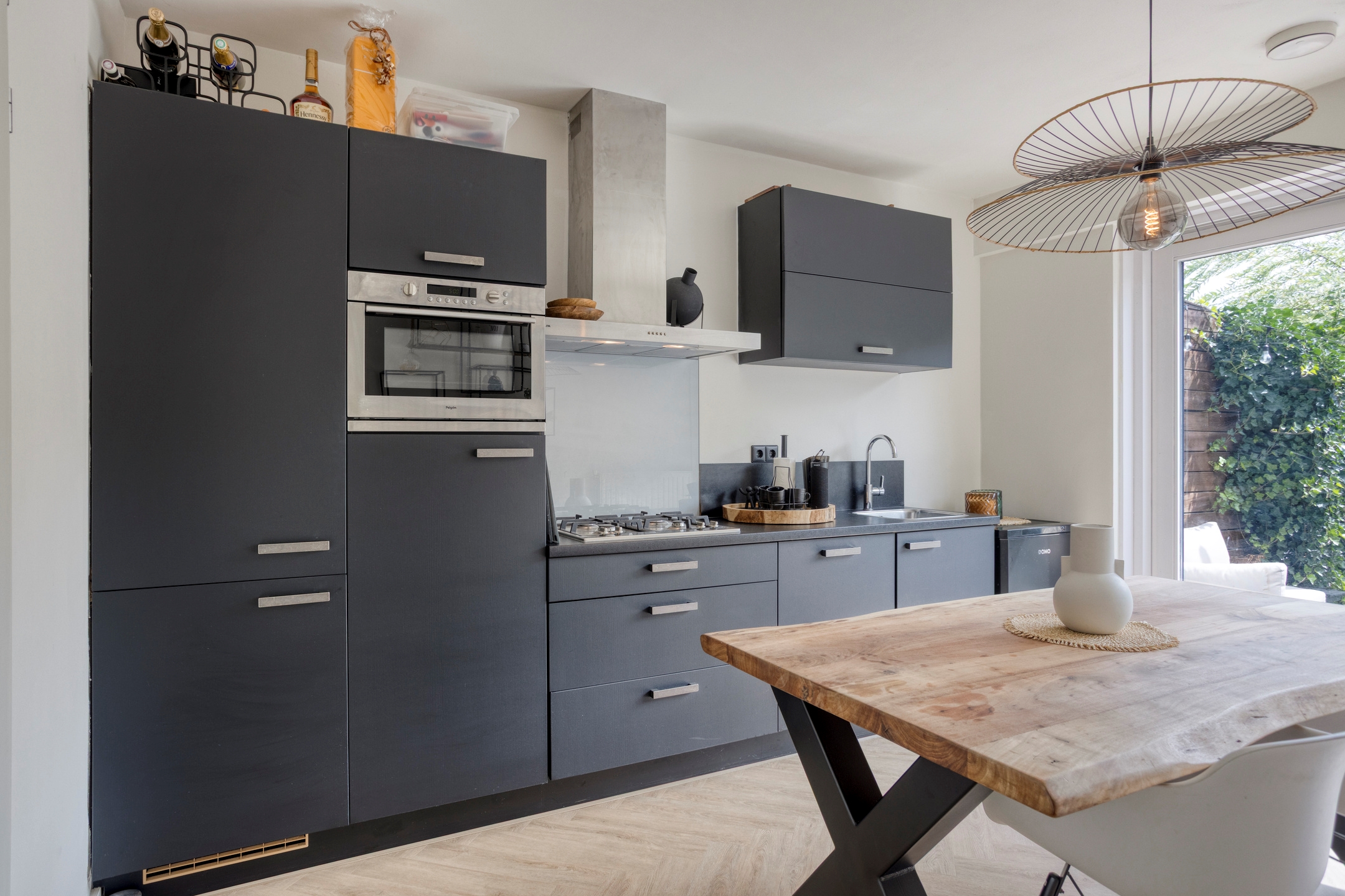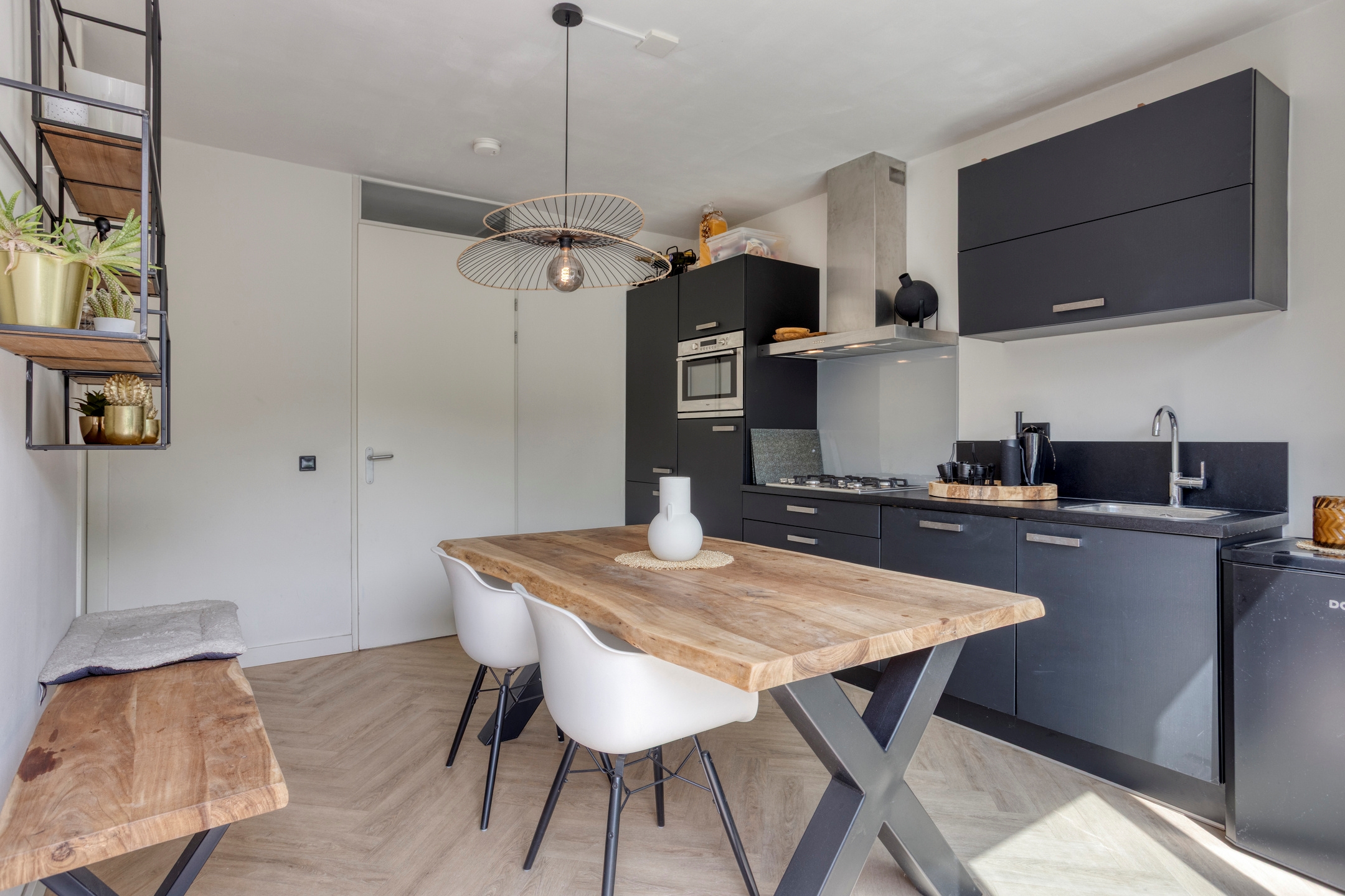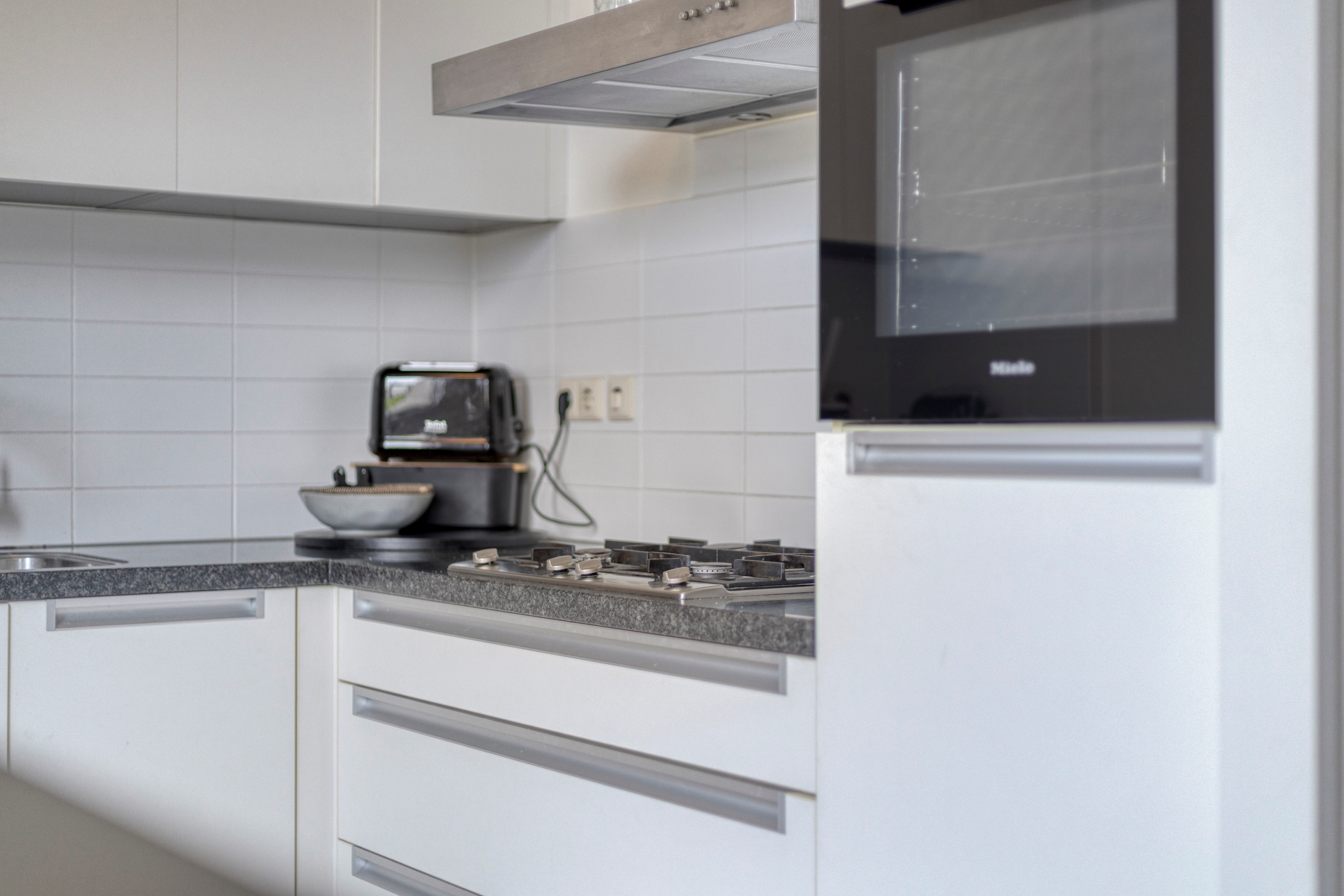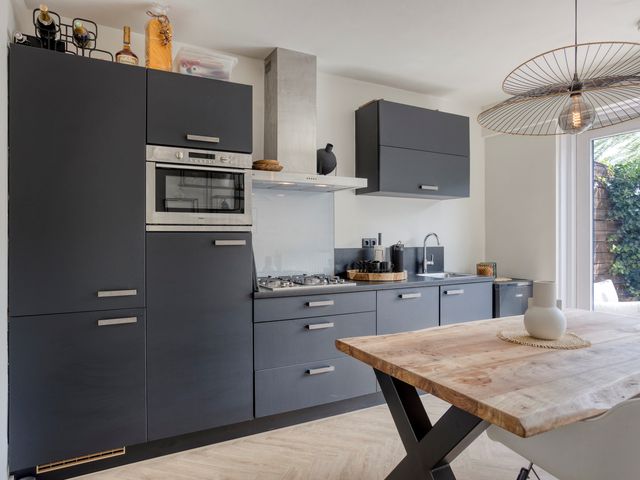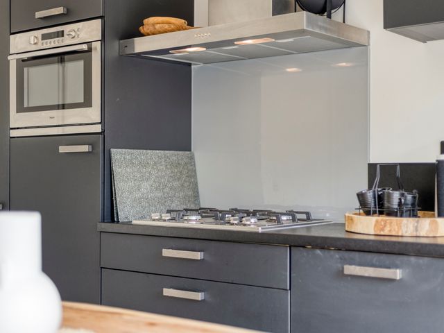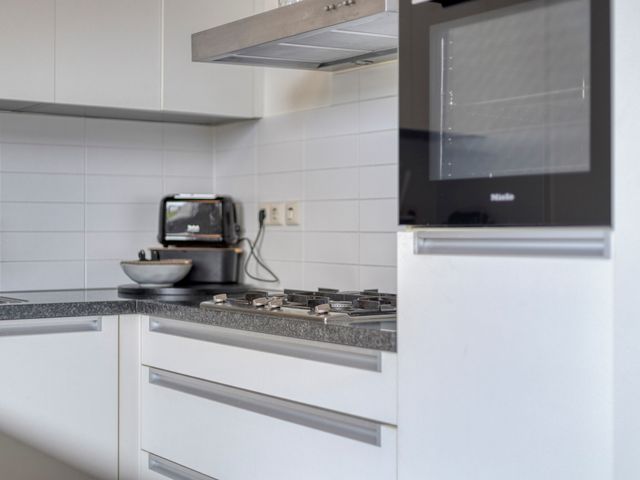 De ruime en compleet ingerichte woonkeuken is voorzien van diverse onder- en bovenkasten en is uitgerust met een 4-pits gasfornuis, rvs afzuigkap, koelkast, vriezer, combi oven en vaatwasser.