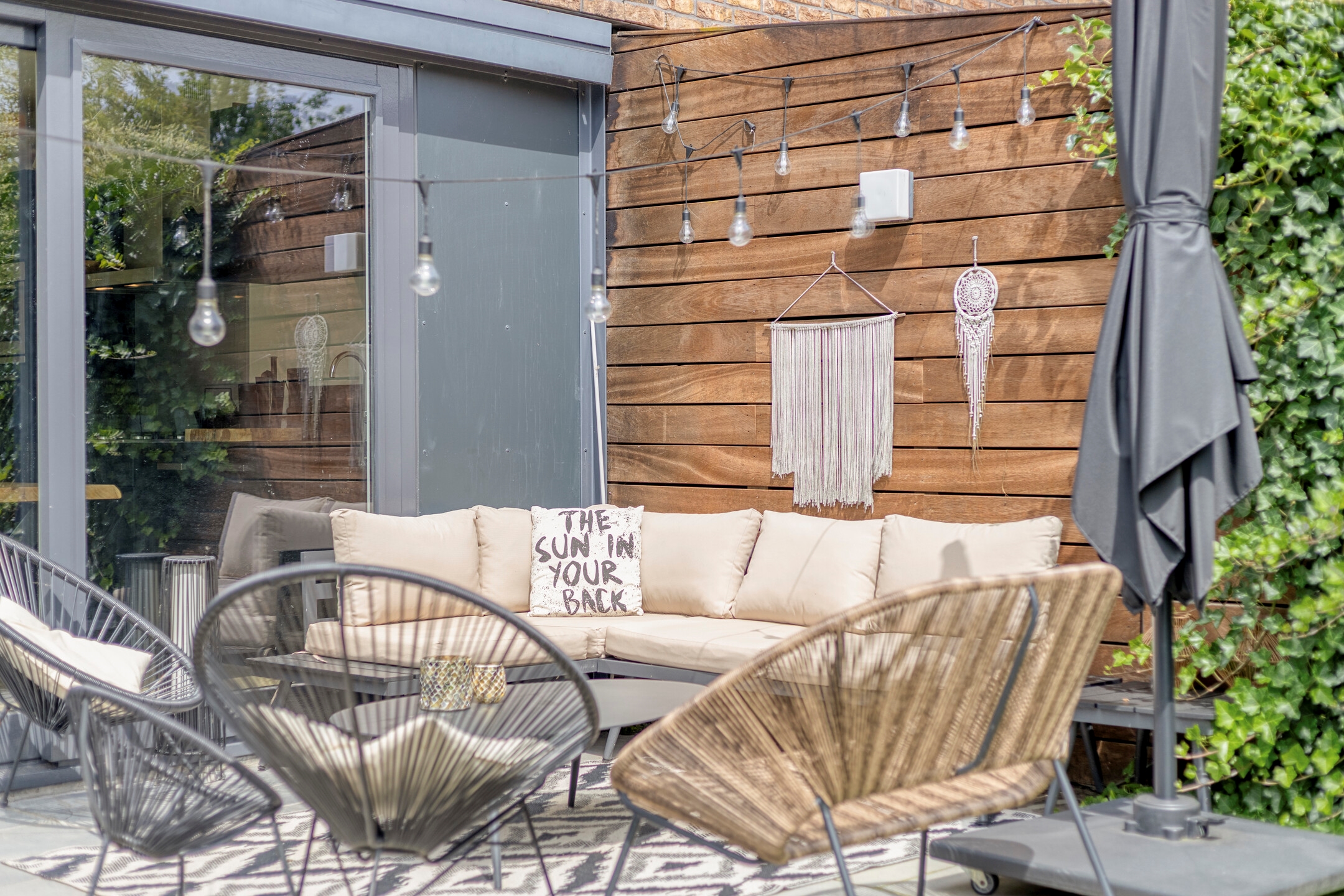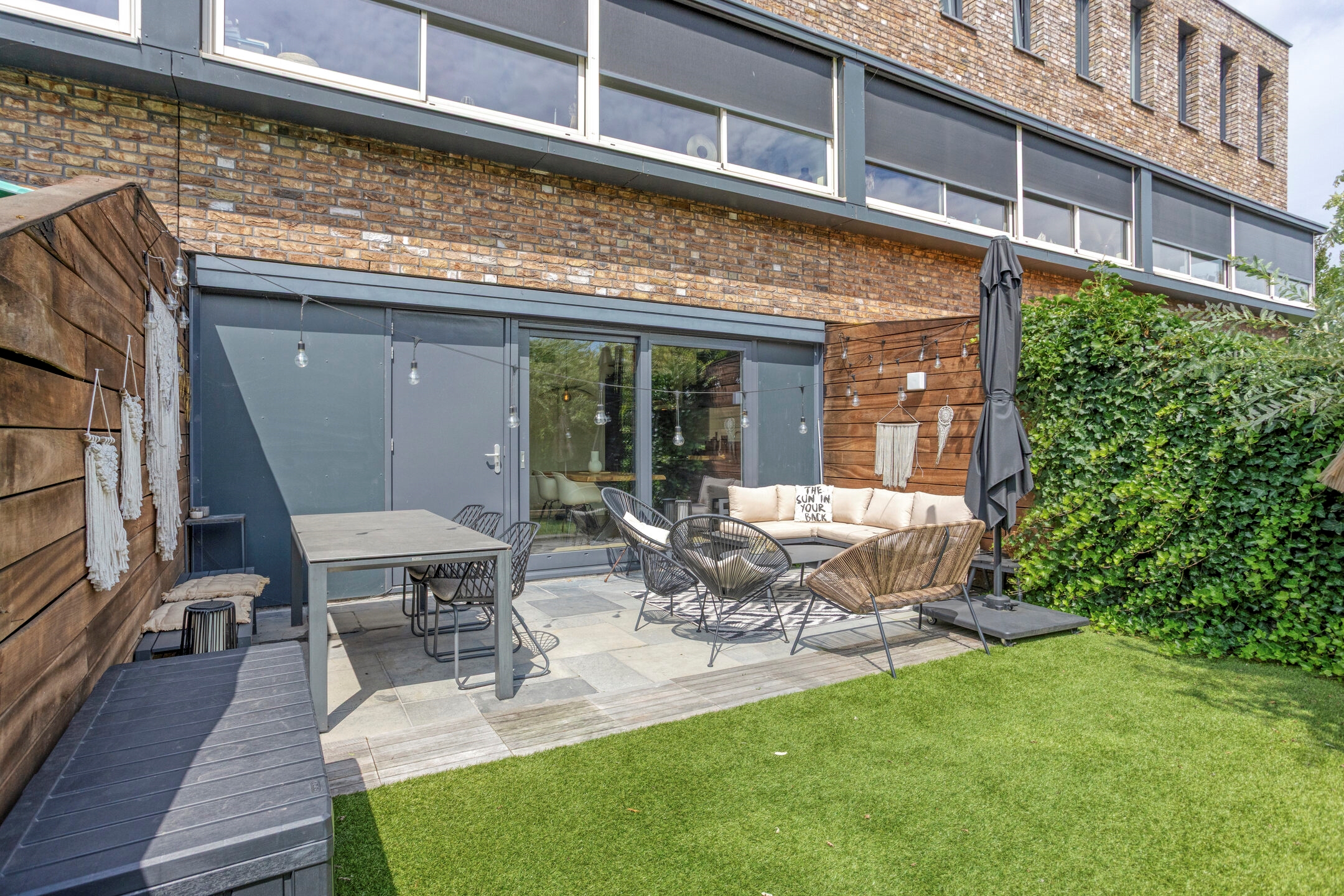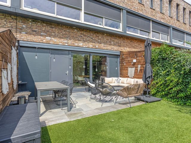 De zonnige achtertuin, gelegen op zuidoosten biedt veel privacy en is voorzien van een gazon, vaste planten en een terras waar het heel de dag heerlijk toeven is.