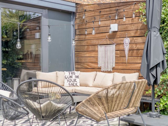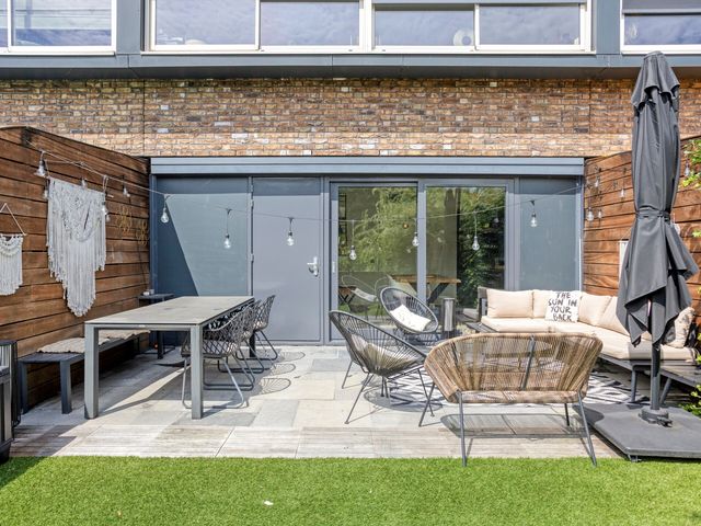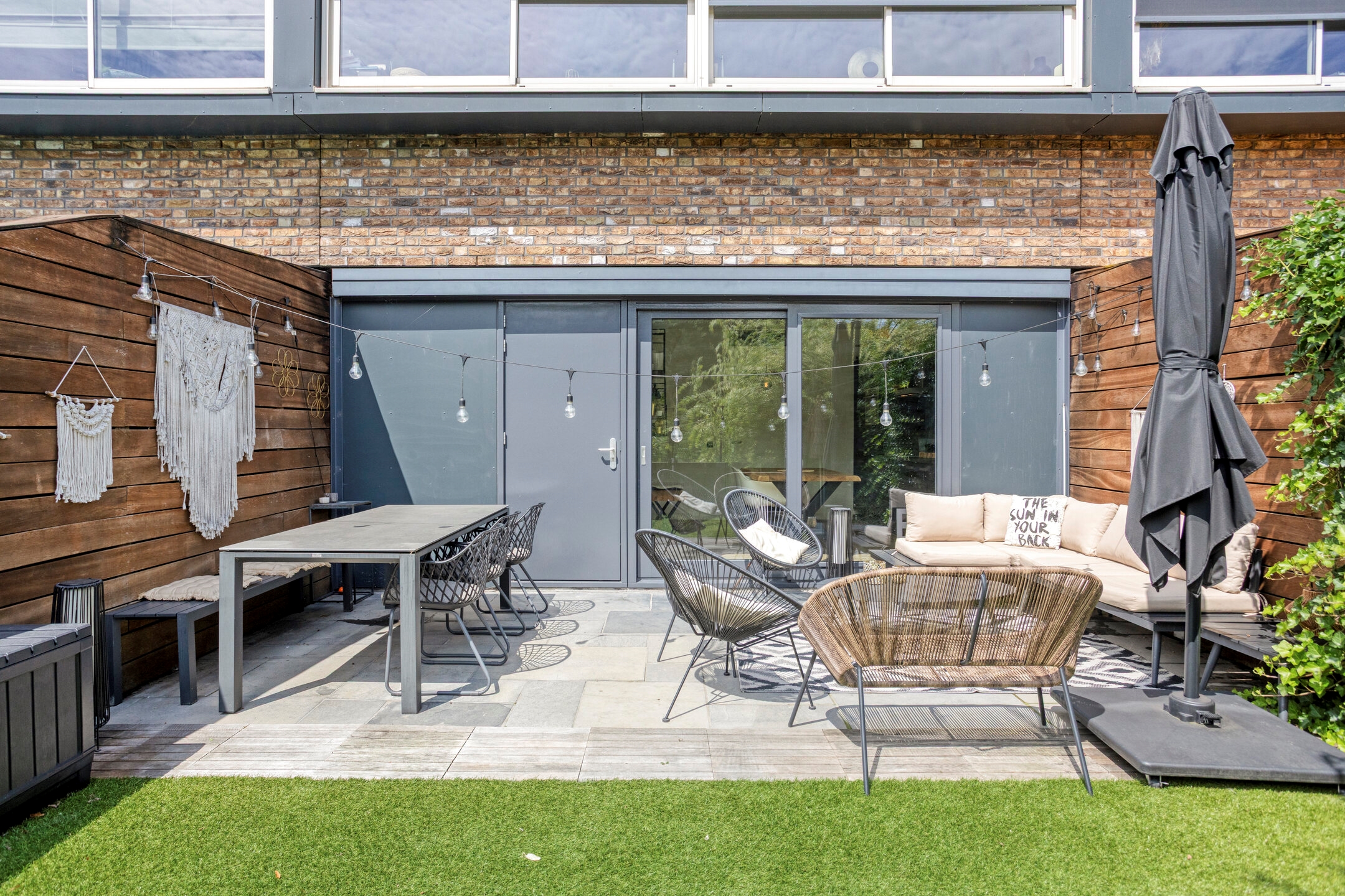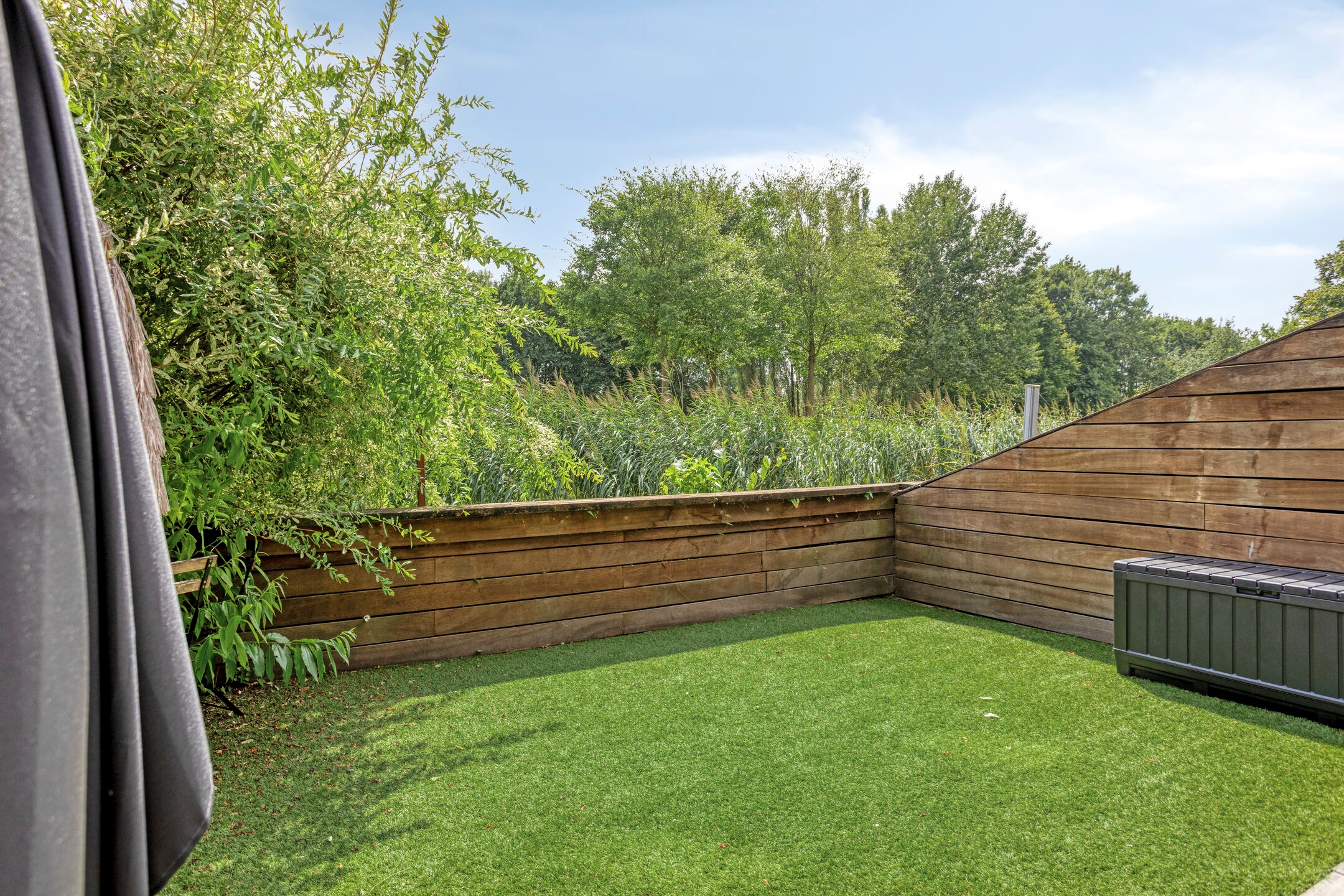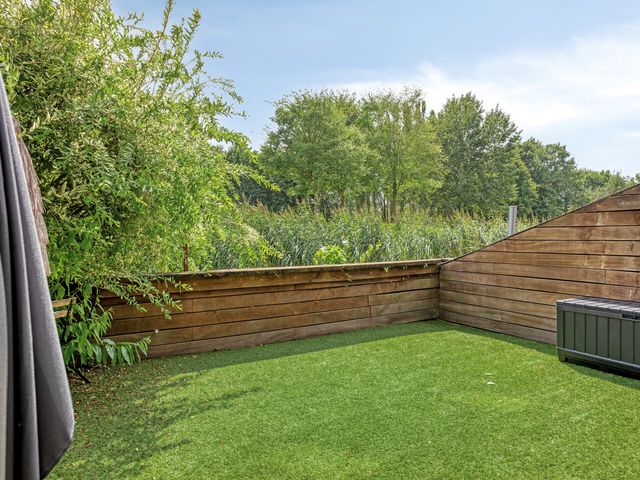 Een grote schuifpui biedt toegang tot de achtertuin die aan het water ligt.