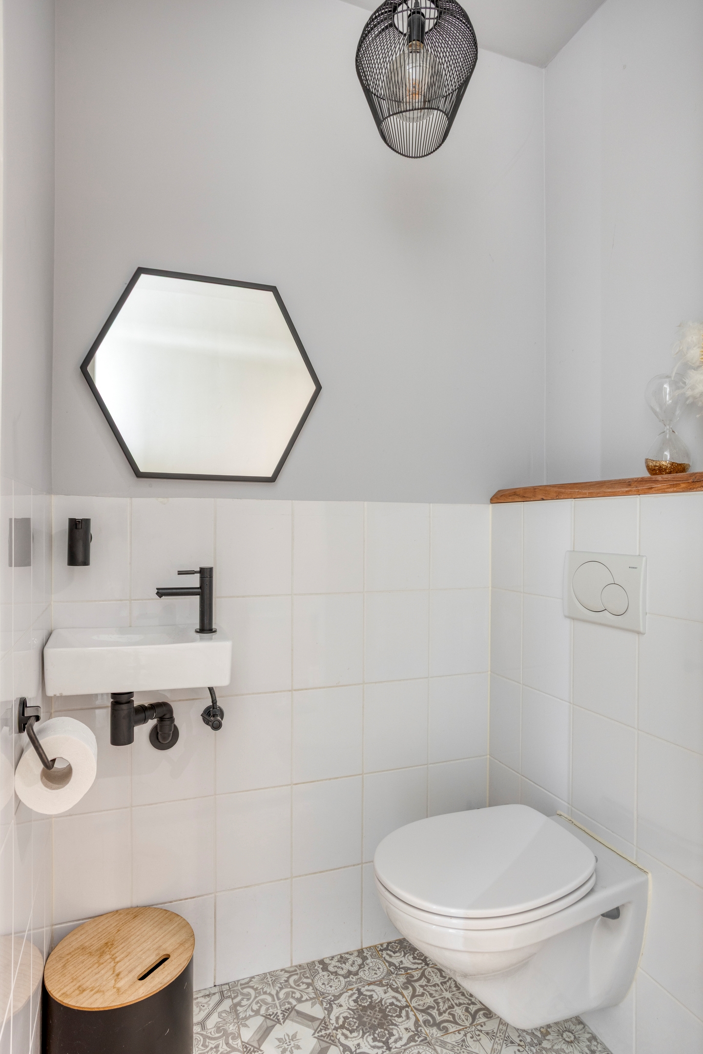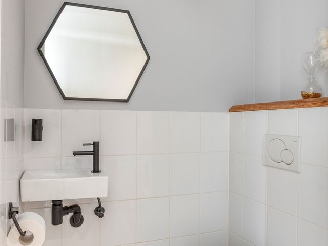 De toiletruimte is deels betegeld en voorzien van een wandcloset en een fonteintje.