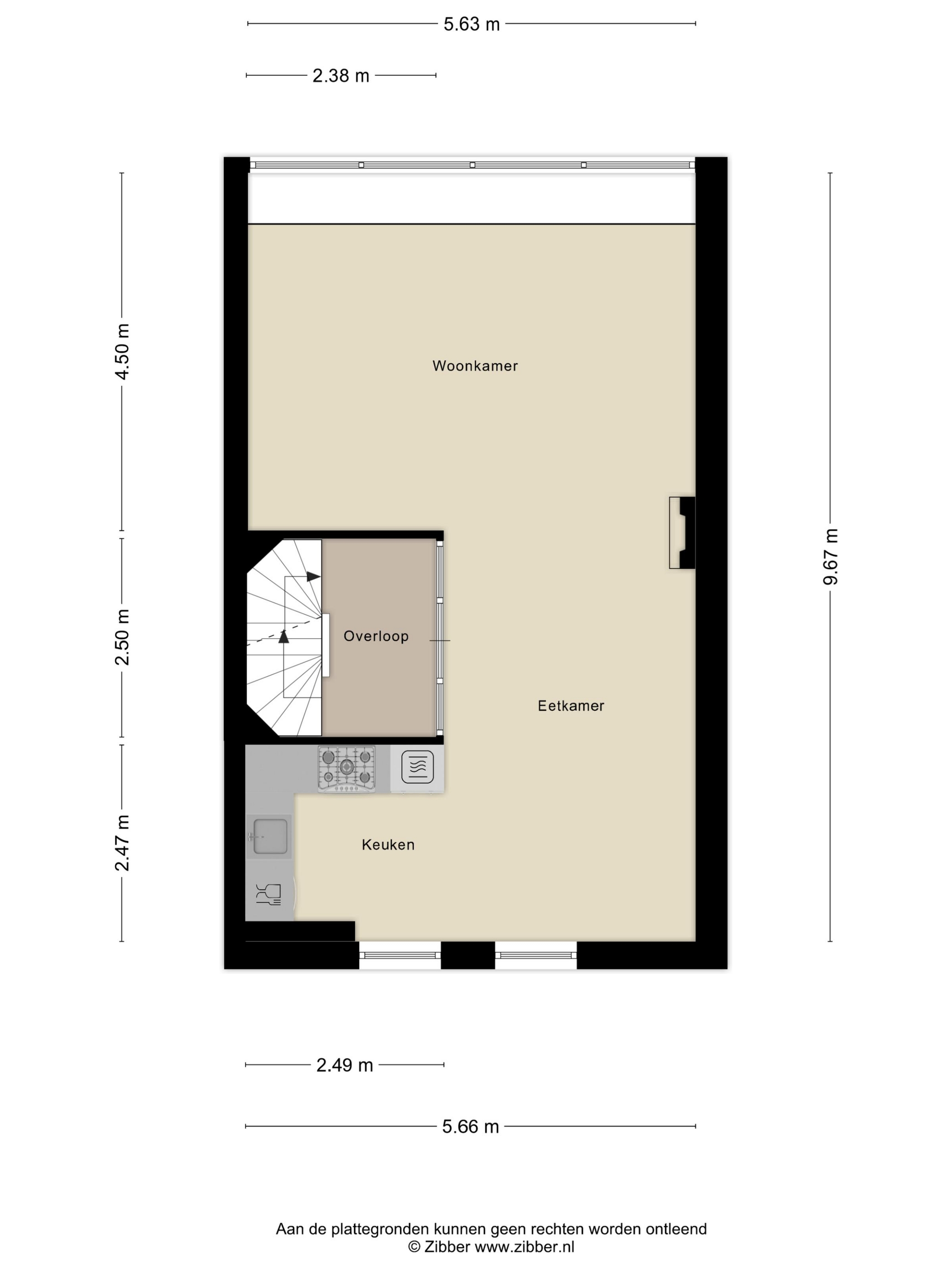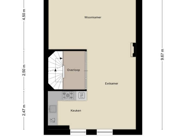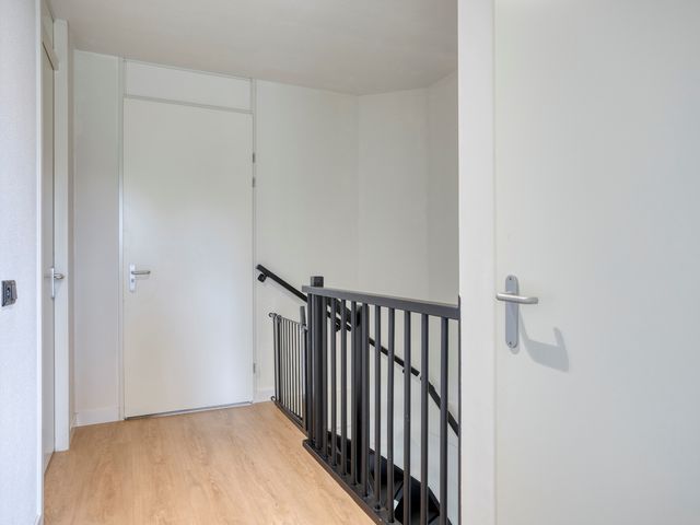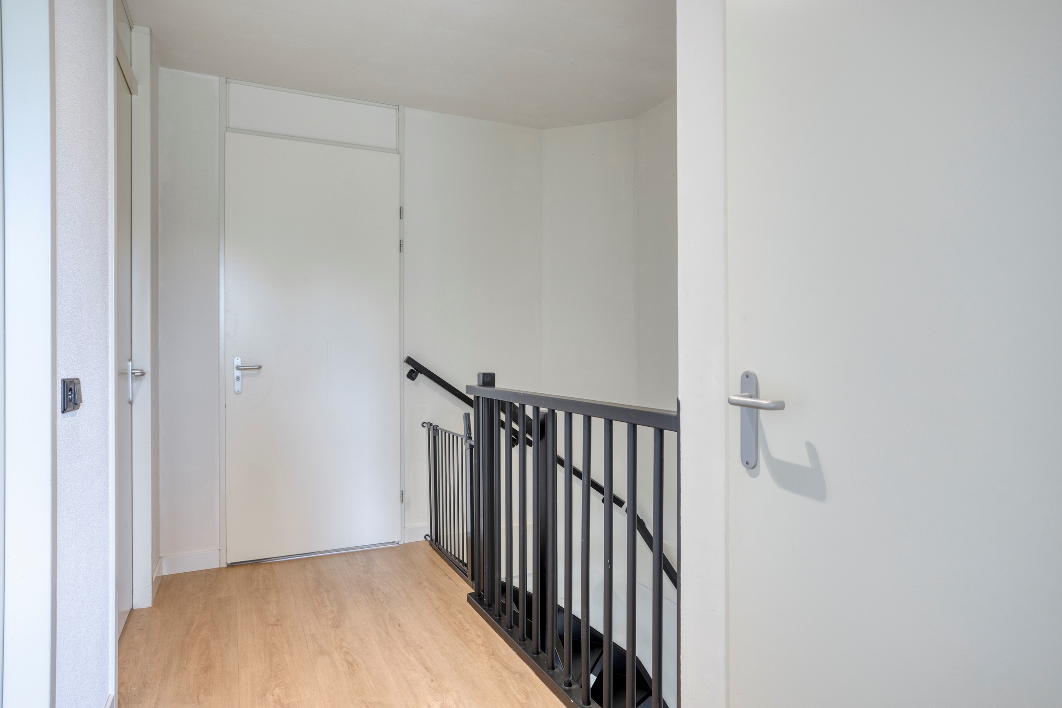 De overloop biedt toegang tot de woonkamer met open keuken en trapopgang naar de 2e verdieping.