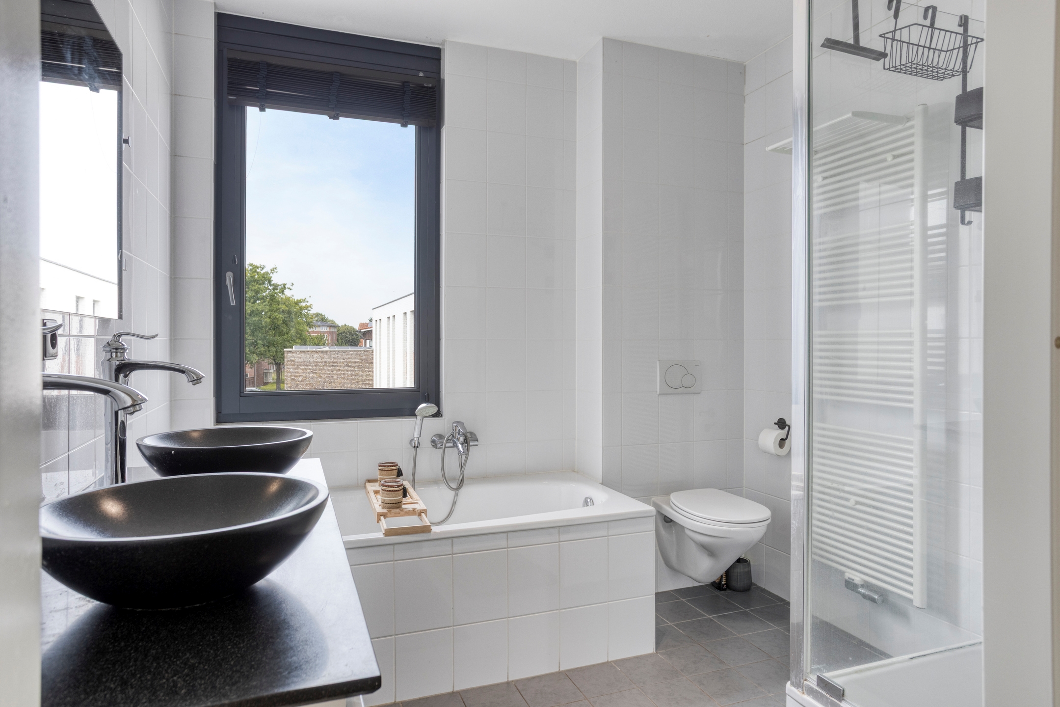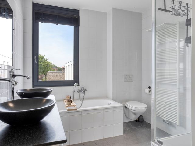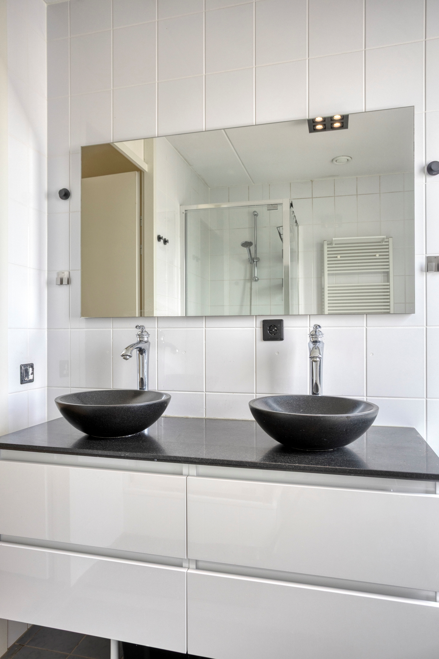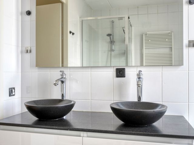 De moderne en compleet ingerichte badkamer is geheel betegeld en voorzien van dubbele waskommen op een badkamermeubel, ruime douche, ligbad en toilet.