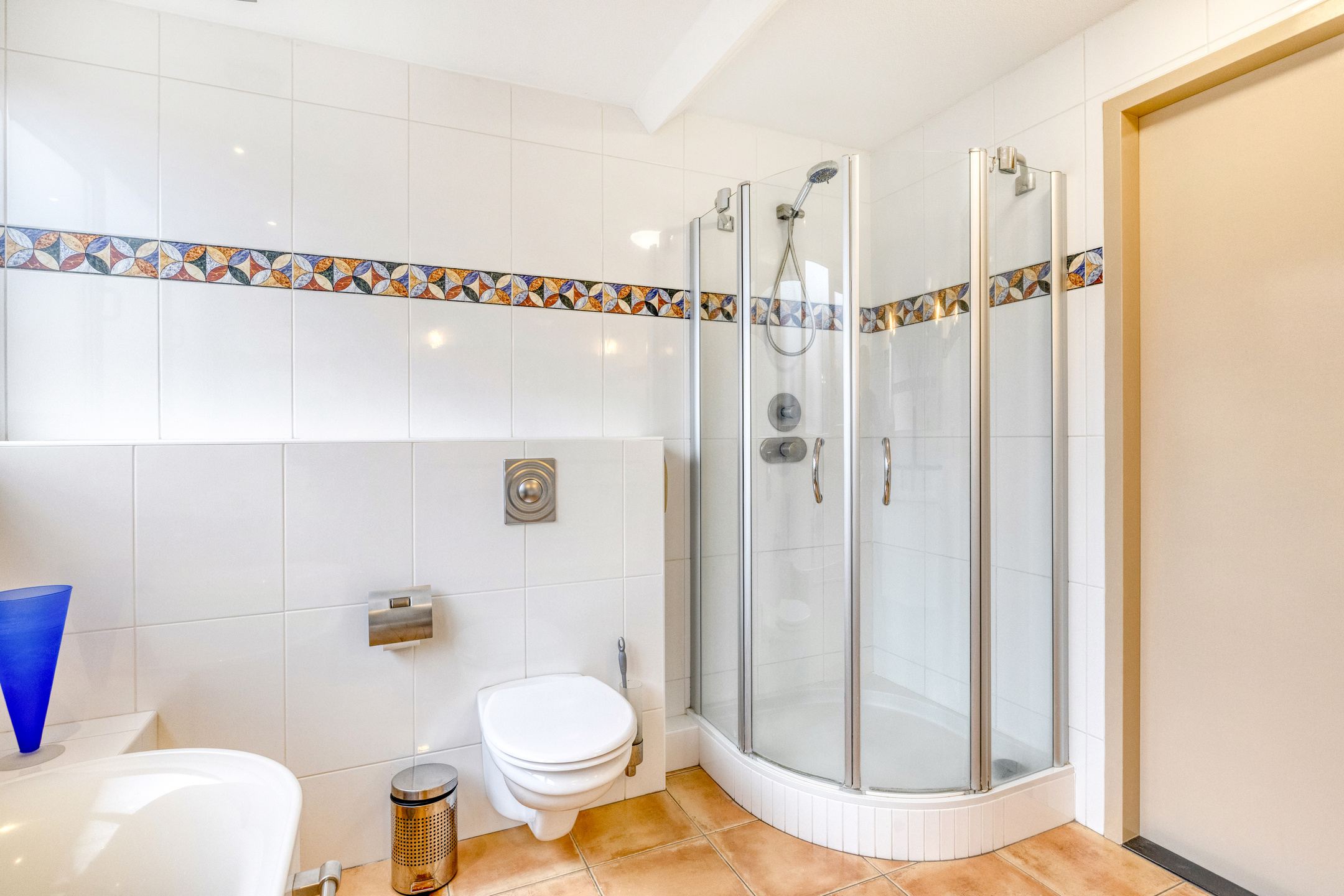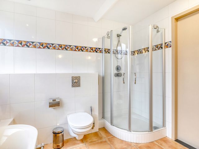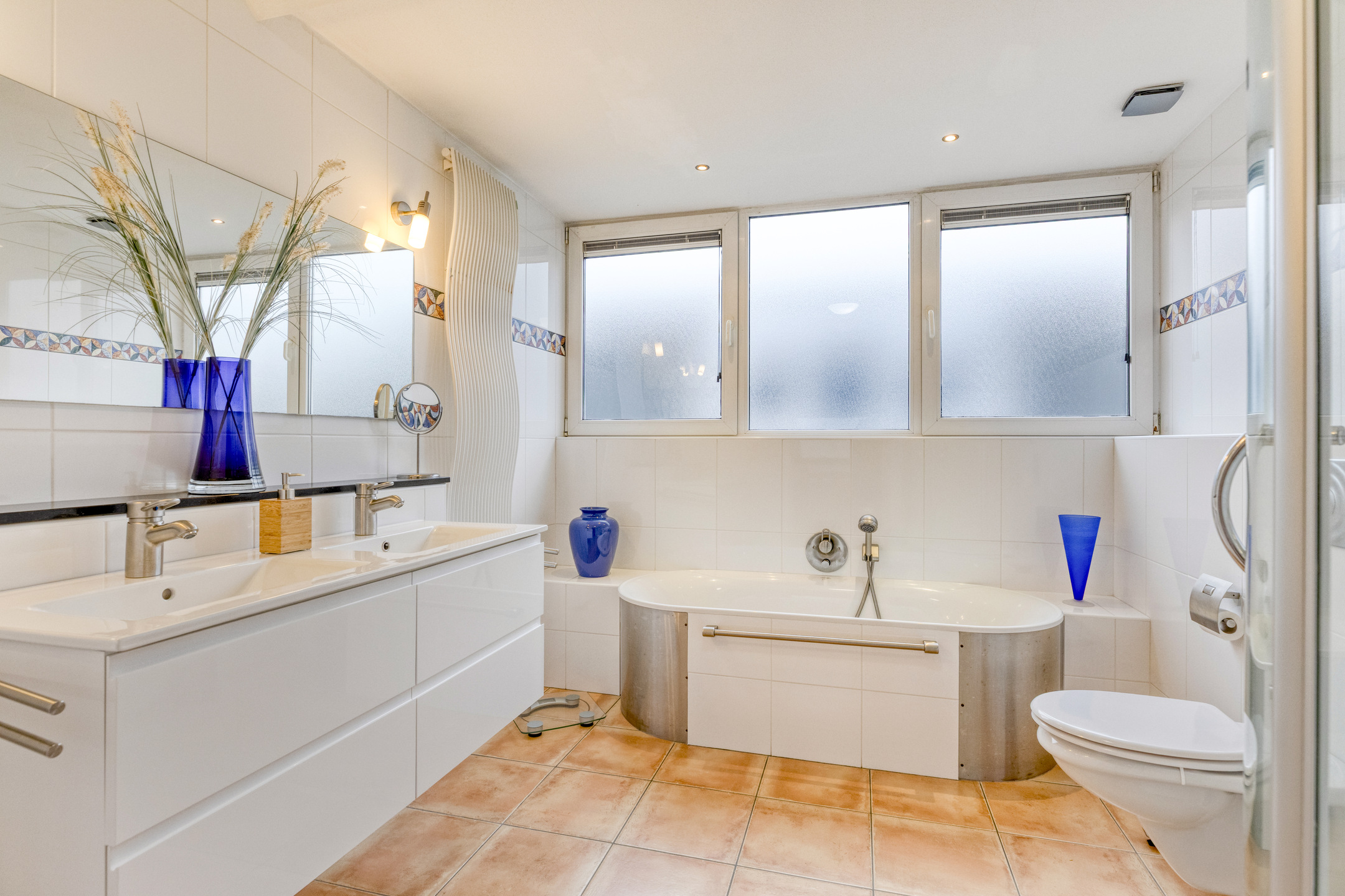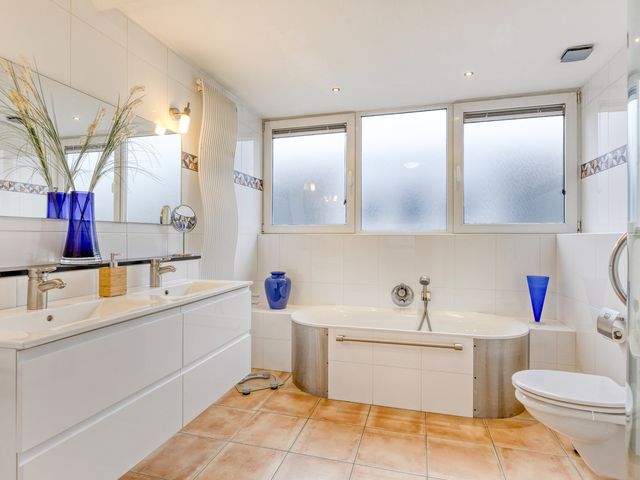 De badkamer is volledig betegeld en stijlvol ingericht met alle moderne gemakken, waaronder een ligbad, een separate douche, een fraai badkamermeubel met dubbele wastafel, een wandcloset en een designradiator.