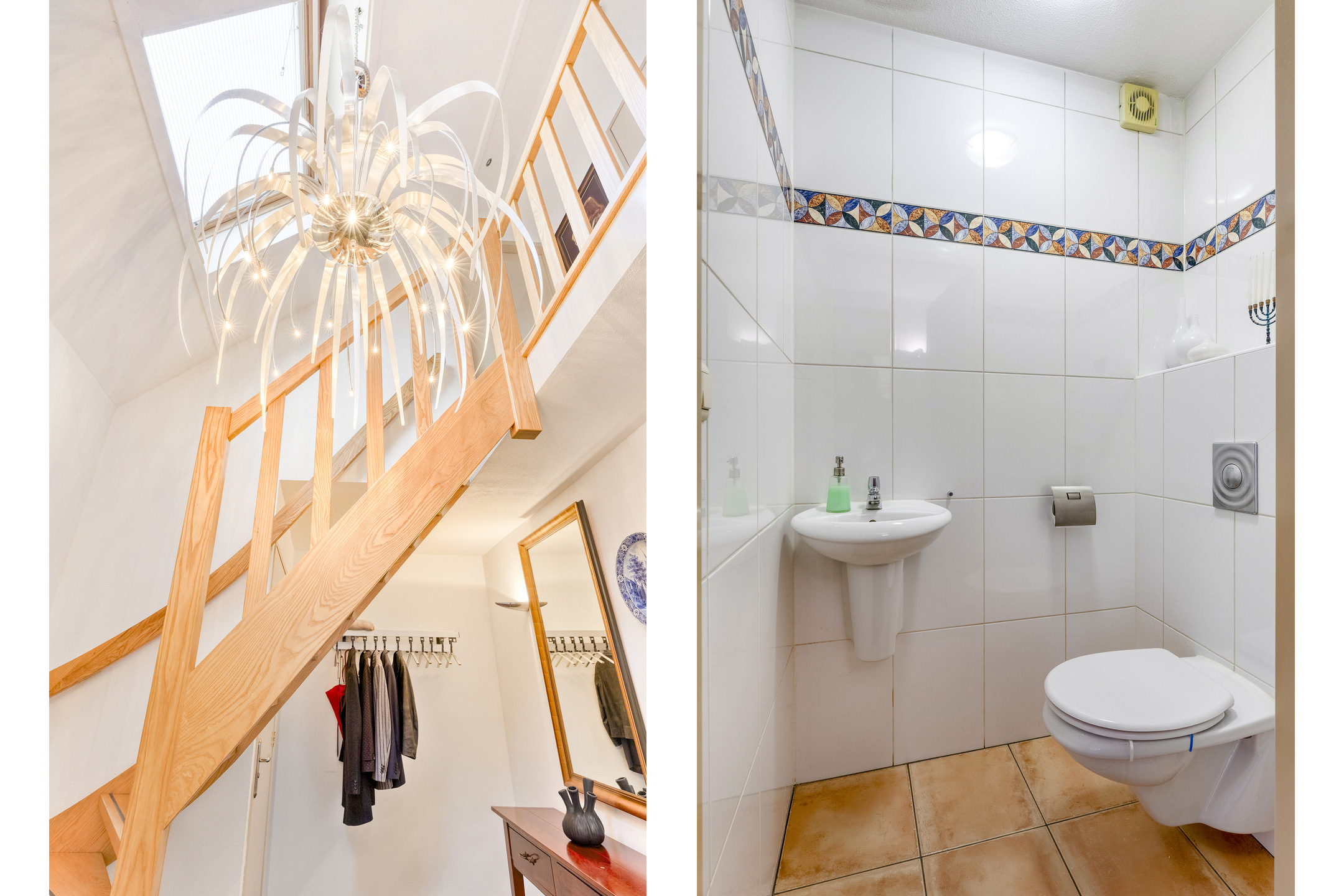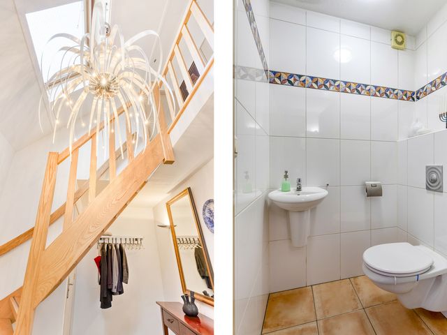 De toiletruimte is volledig betegeld en uitgevoerd met een wandcloset en een fonteintje, passend bij de verzorgde uitstraling van de woning.