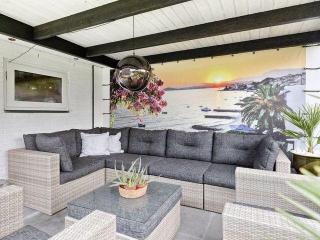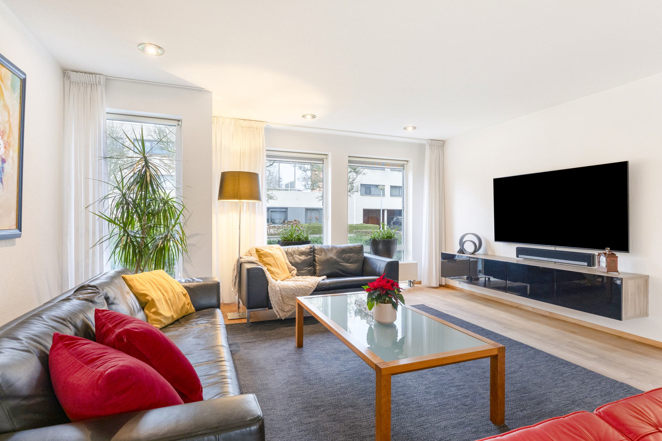 De wanden en plafonds zijn strak gestuct, het plafond aan de voorzijde is bovendien voorzien van ingebouwde spots, wat bijdraagt aan de luxe en moderne uitstraling van deze fijne leefruimte.