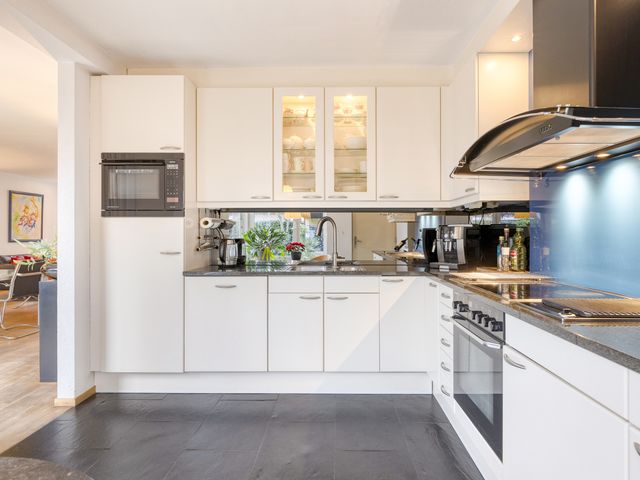 De halfopen keuken is praktisch en verzorgd uitgevoerd en beschikt over diverse onder- en bovenkasten die zorgen voor volop bergruimte. Het geheel wordt gecompleteerd door een stijlvol natuurstenen werkblad en een complete set inbouwapparatuur, waaronder een 4-pits keramische kookplaat, afzuigkap, aparte magnetron, oven en een koel-/vriescombinatie.