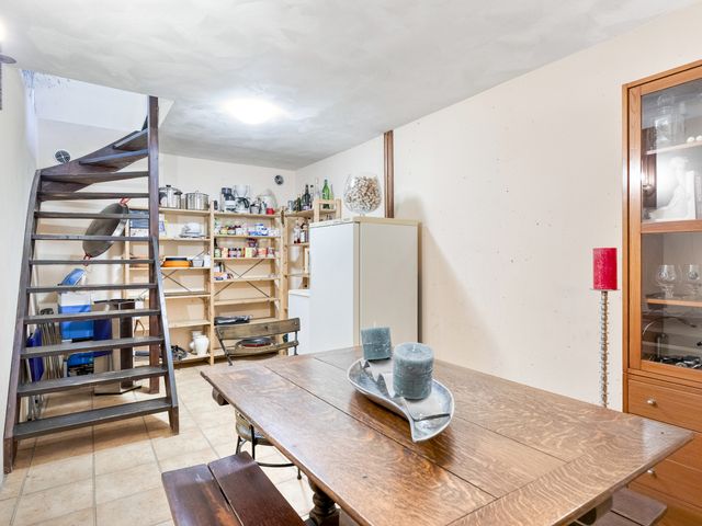 Via een deur in de keuken bereik je de bijkeuken, een praktische en veelzijdige ruimte. Vanuit hier leidt een trap naar de ruime, multifunctionele kelder, die zich uitstekend leent voor uiteenlopende doeleinden, zoals een sfeervolle wijnkelder of een ontspannen chillruimte, de mogelijkheden zijn veelzijdig.