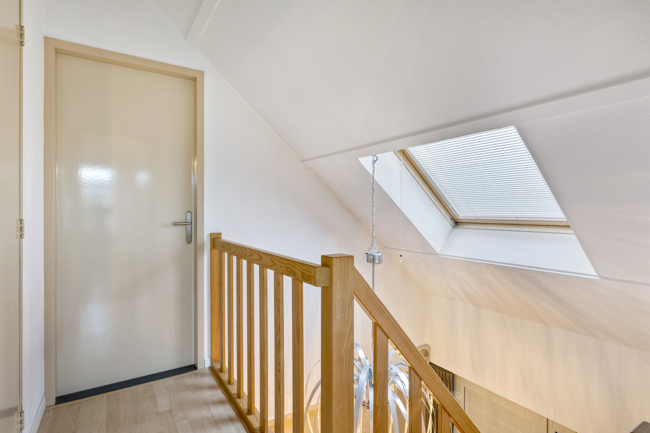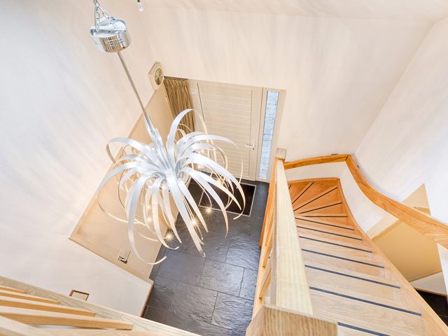 Vanuit de royale hal bereik je via de open houten trap de eerste verdieping. De ruime overloop biedt toegang tot twee comfortabele slaapkamers en een luxe uitgevoerde badkamer.