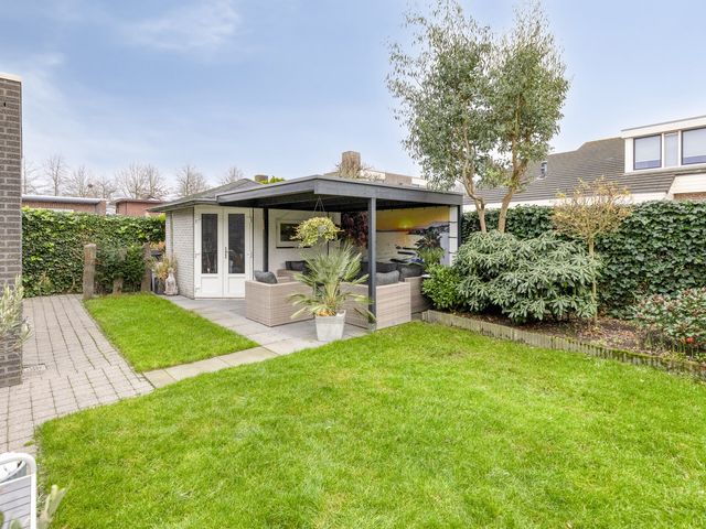 De zonnige achtertuin ligt op het zuiden, een heerlijke privacy biedende tuin waarin je kunt genieten van de zon, maar ook een schaduwplekje kunt op zoeken. De tuin is voorzien van sierbestrating, diverse vaste planten, gazon, een waterkraan en als extra nog een tuinschuurtje met een sfeervolle overkapping.