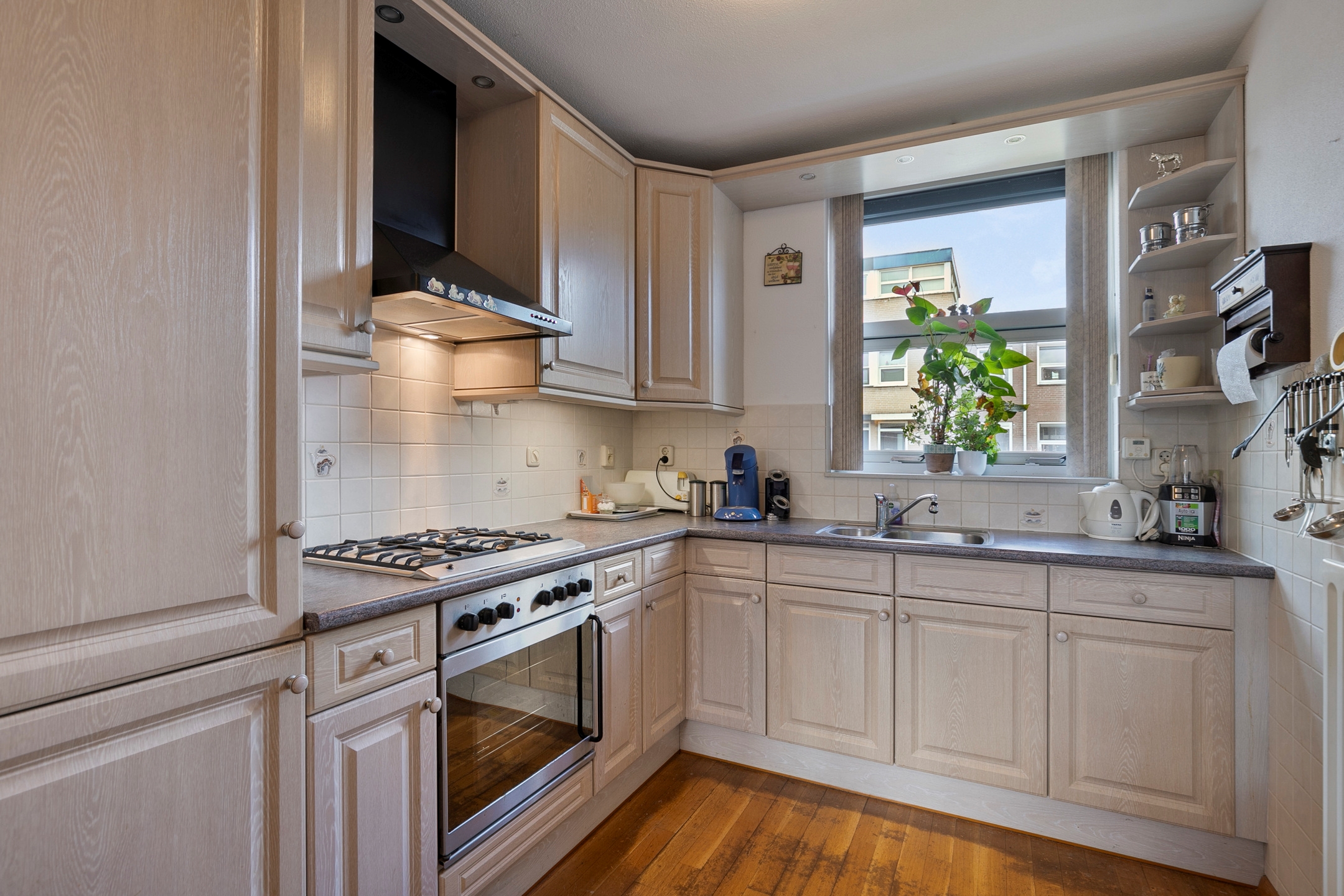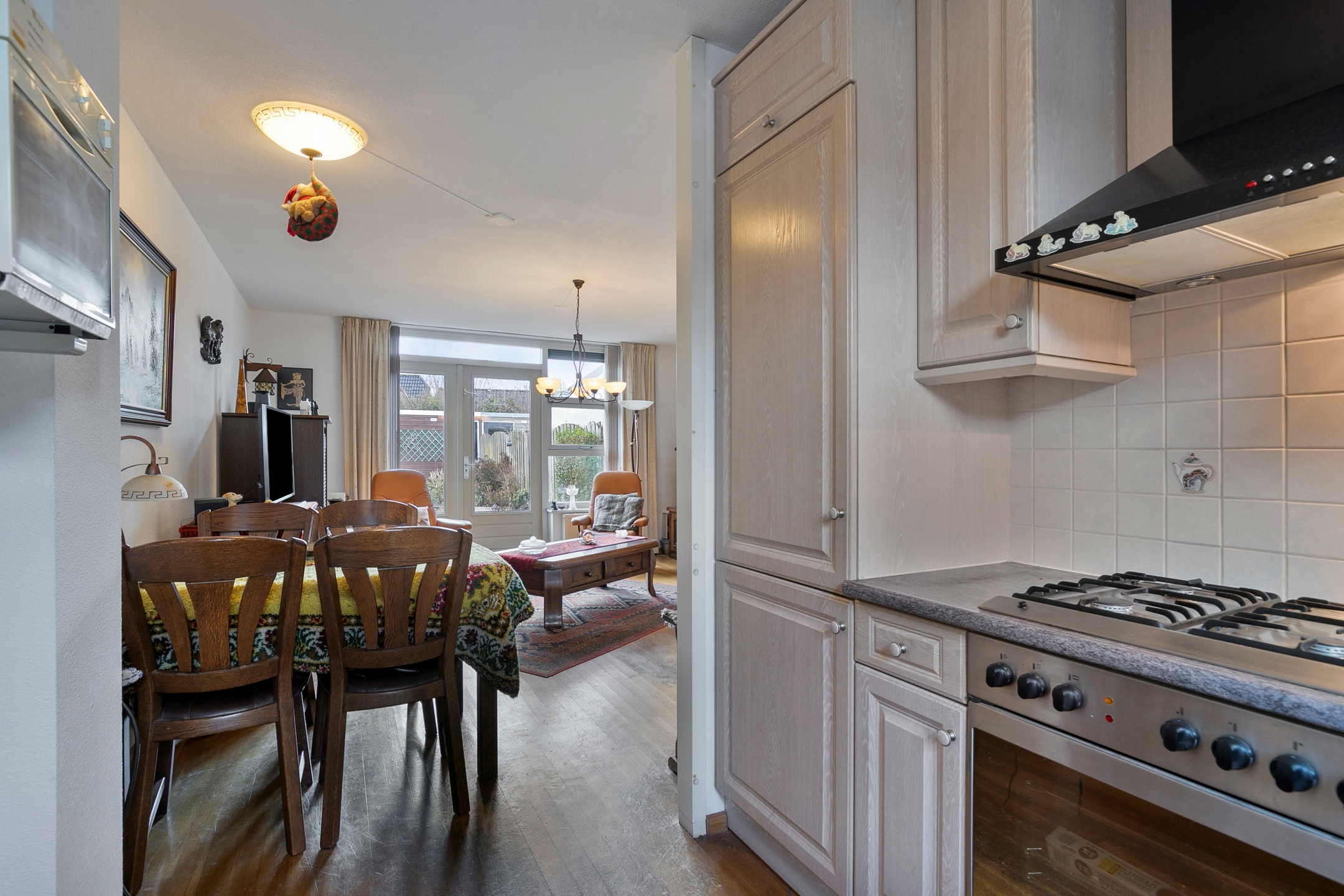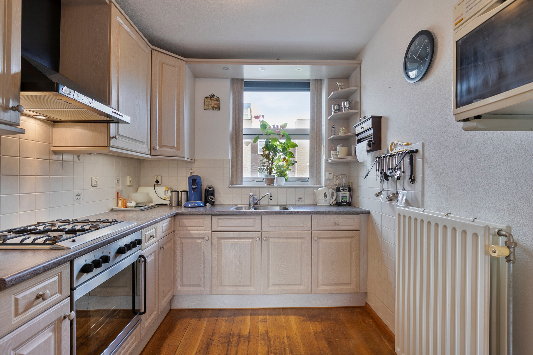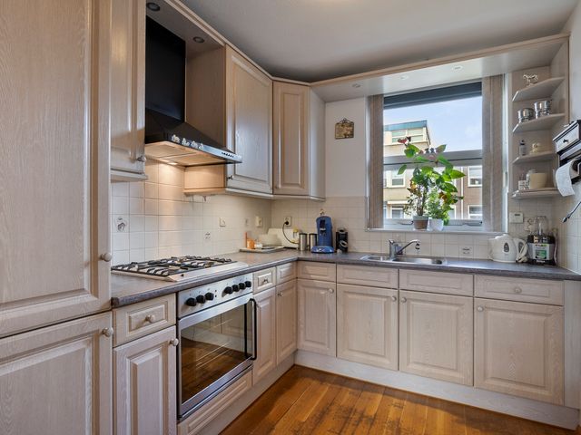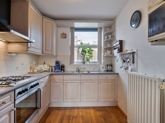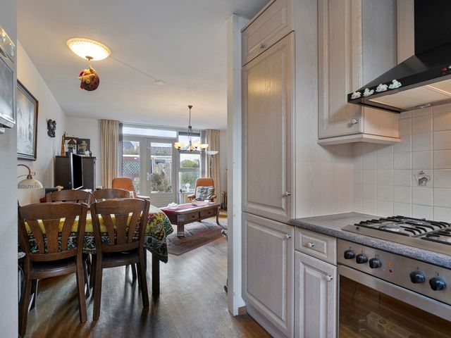 De open keuken is compleet ingericht en voorzien van een 4-pits gaskookplaat, afzuigkap, oven en een koel-/vriescombinatie. De praktische indeling zorgt voor optimaal kookgemak en een prettige verbinding met de woonkamer.