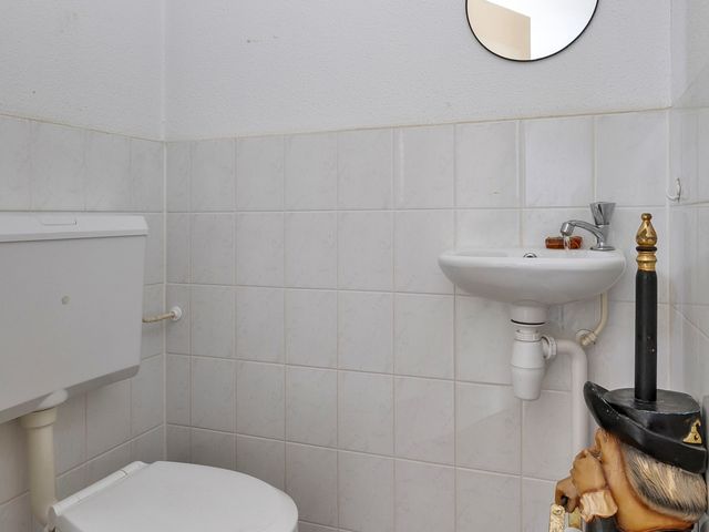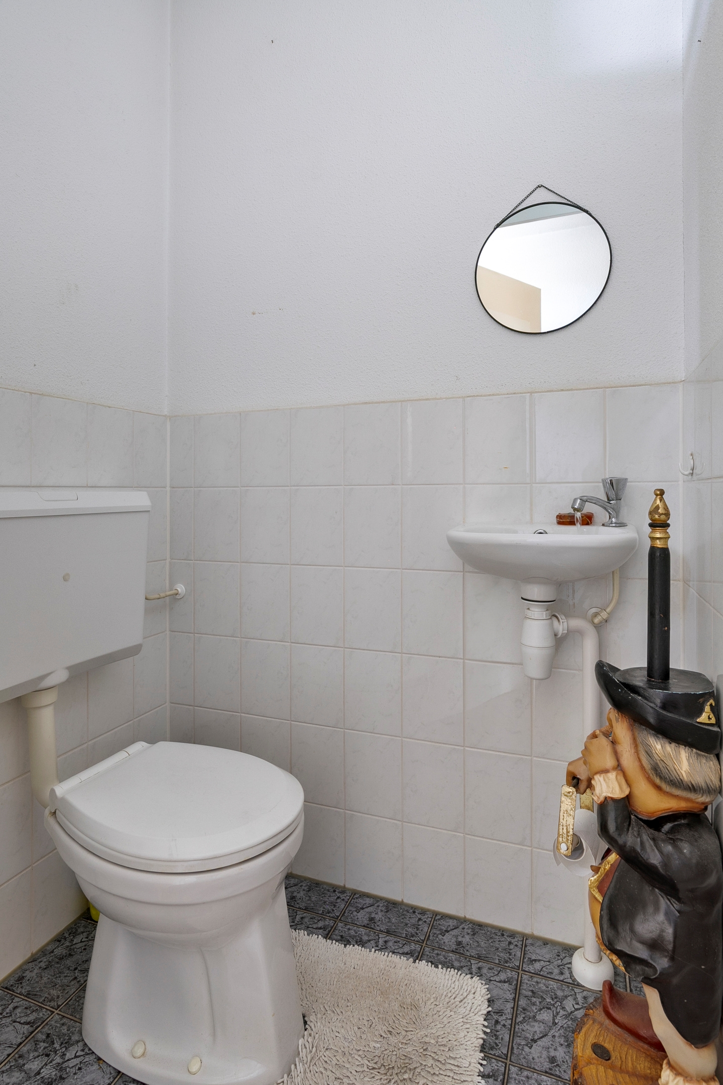 Het toilet is deels betegeld en voorzien van een closet en fontein.