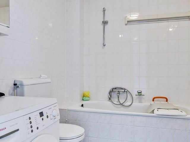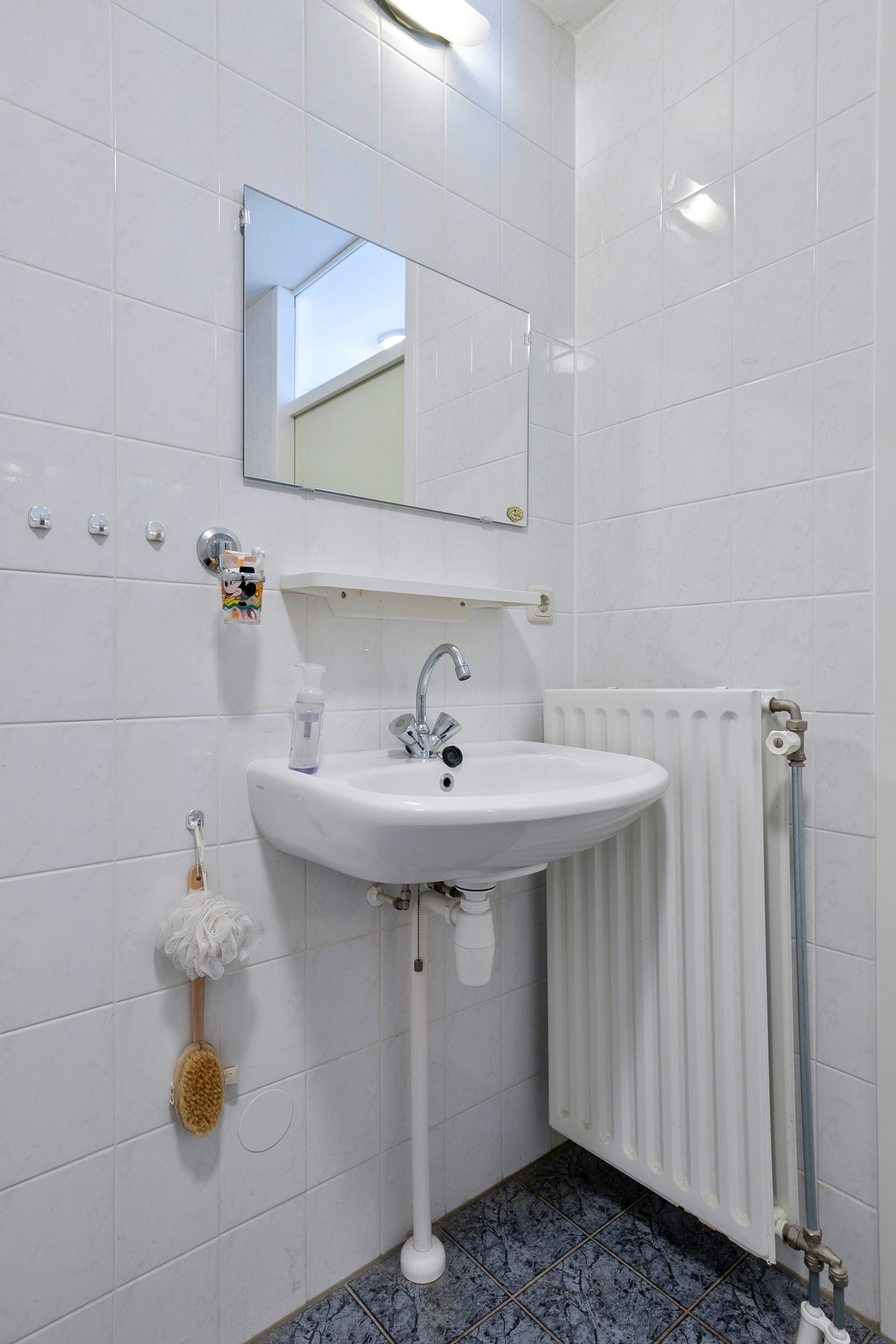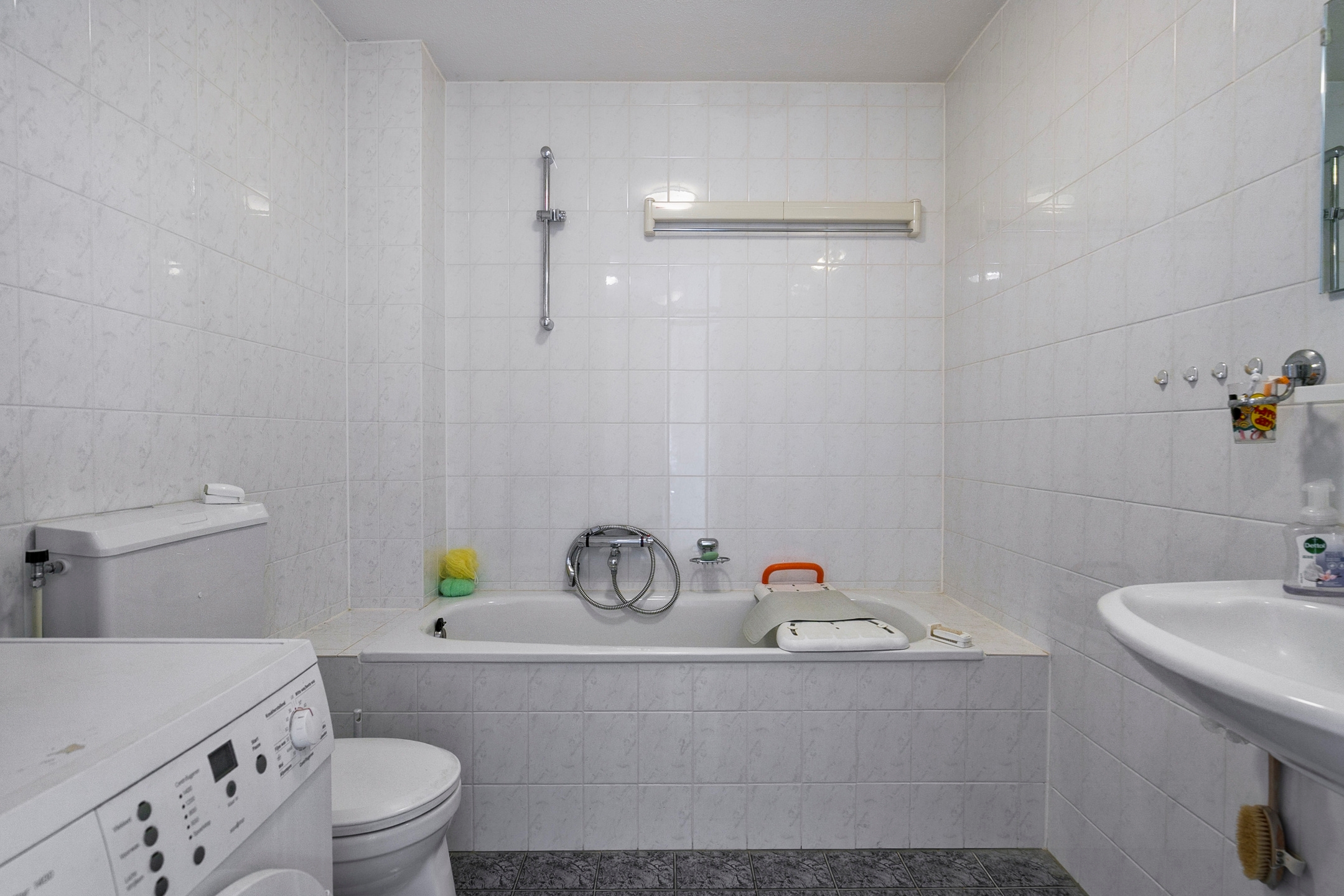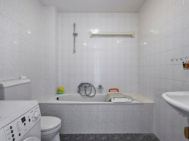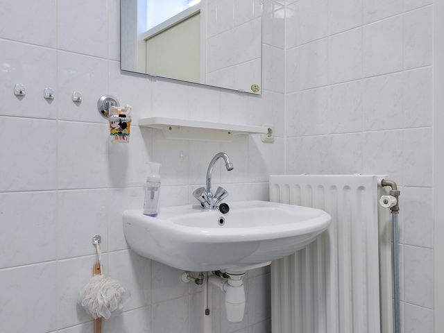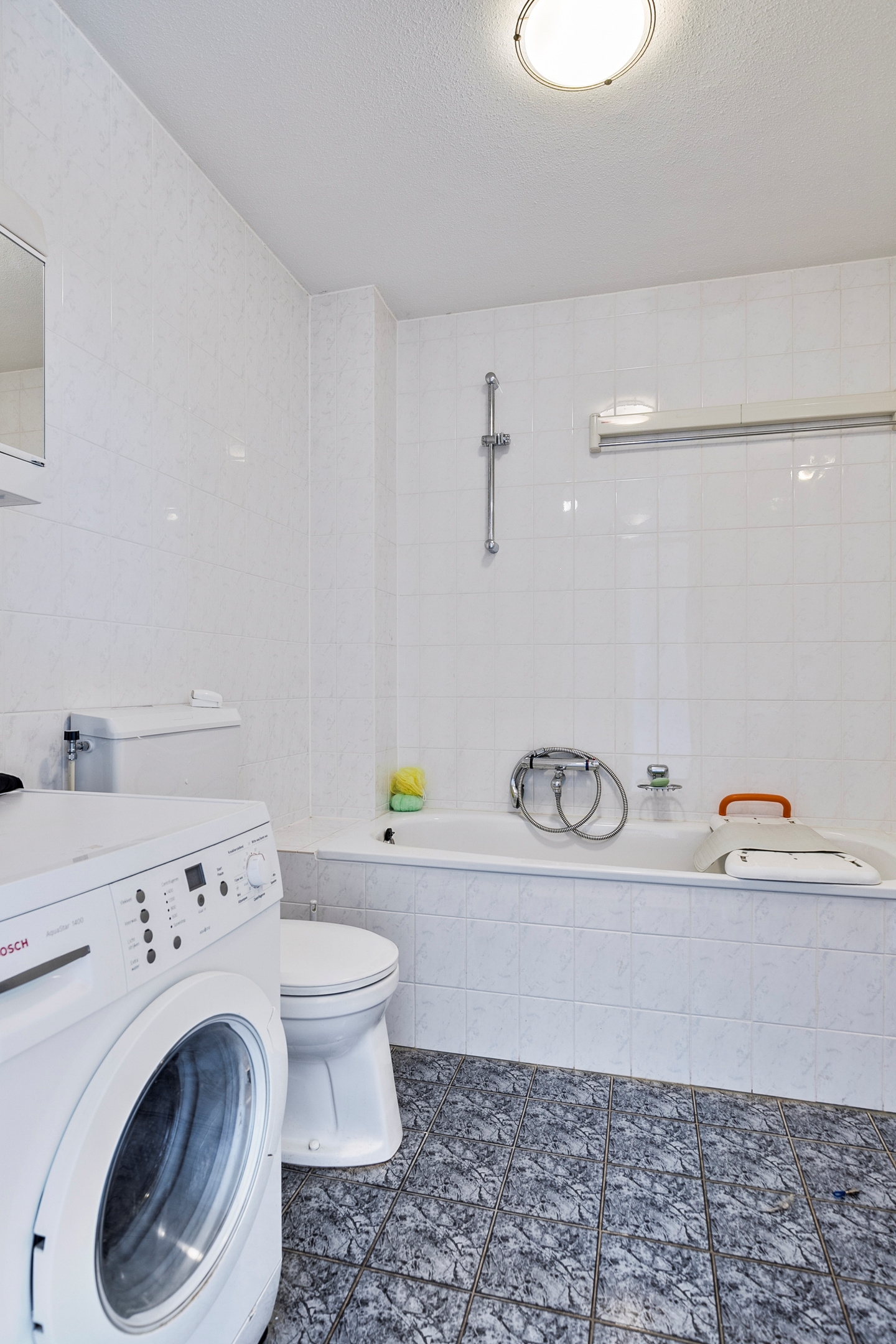 De badkamer is volledig betegeld en uitgerust met een ligbad met douche, een wastafel en een toilet. Daarnaast bevinden zich hier de aansluitingen voor de wasmachine.