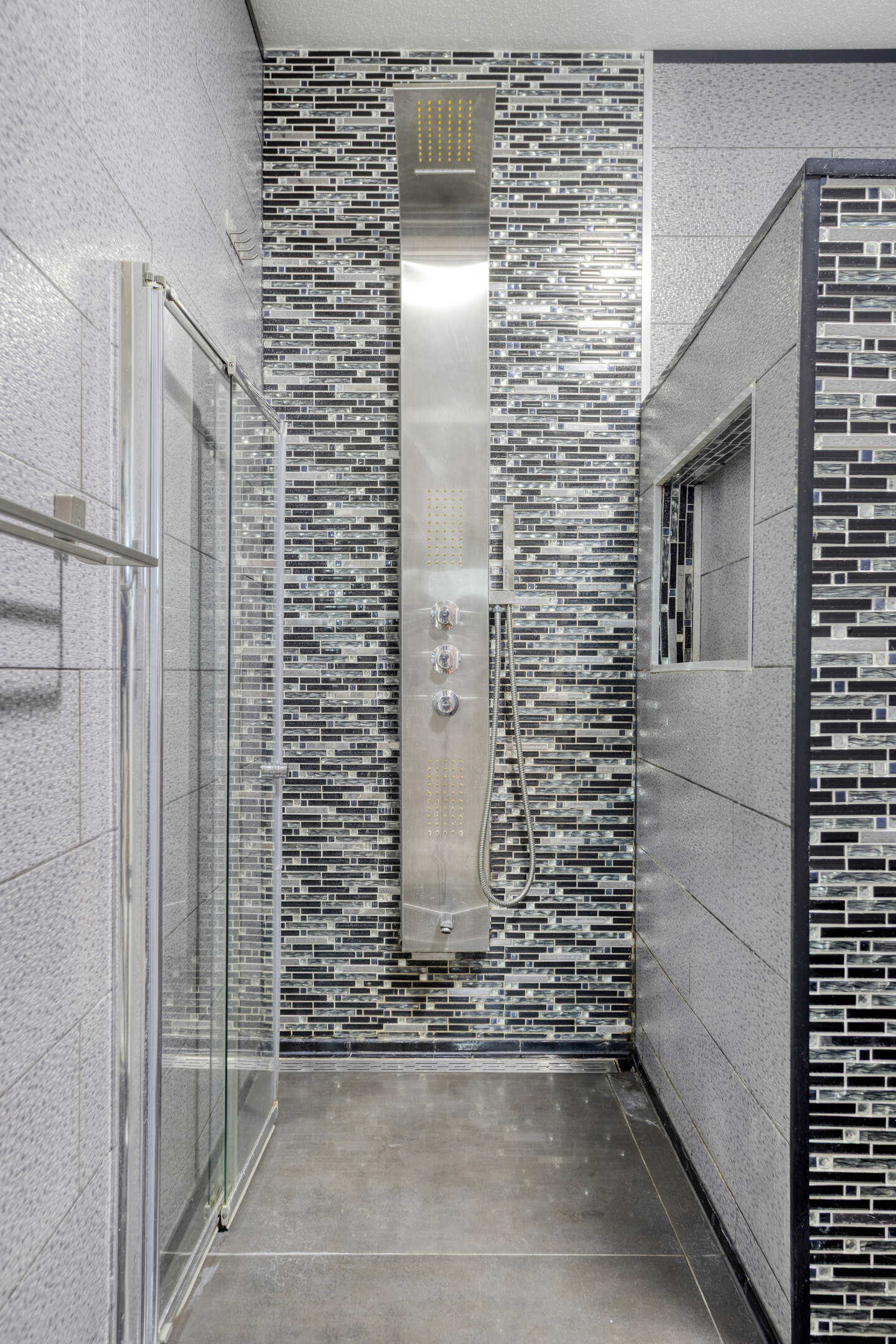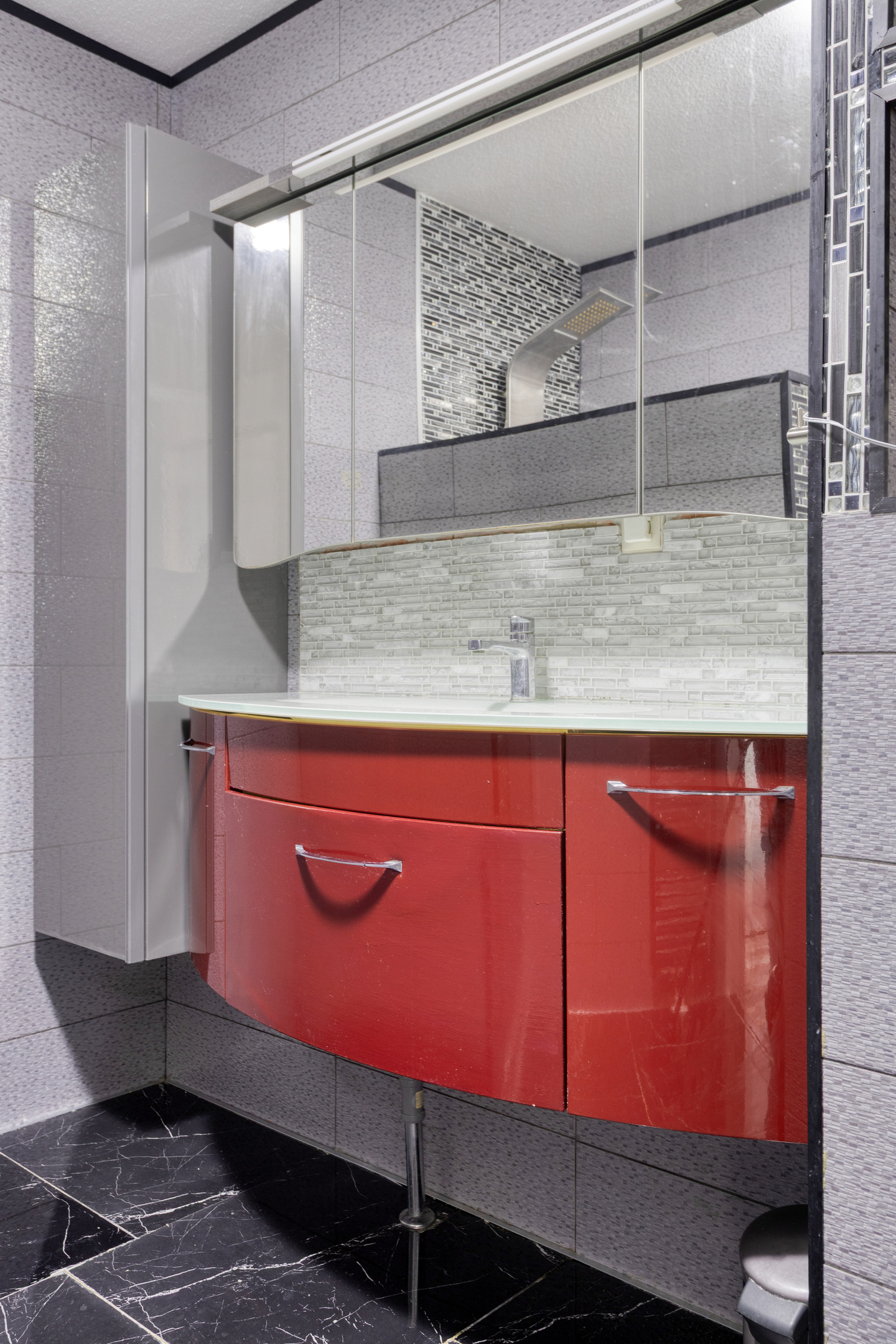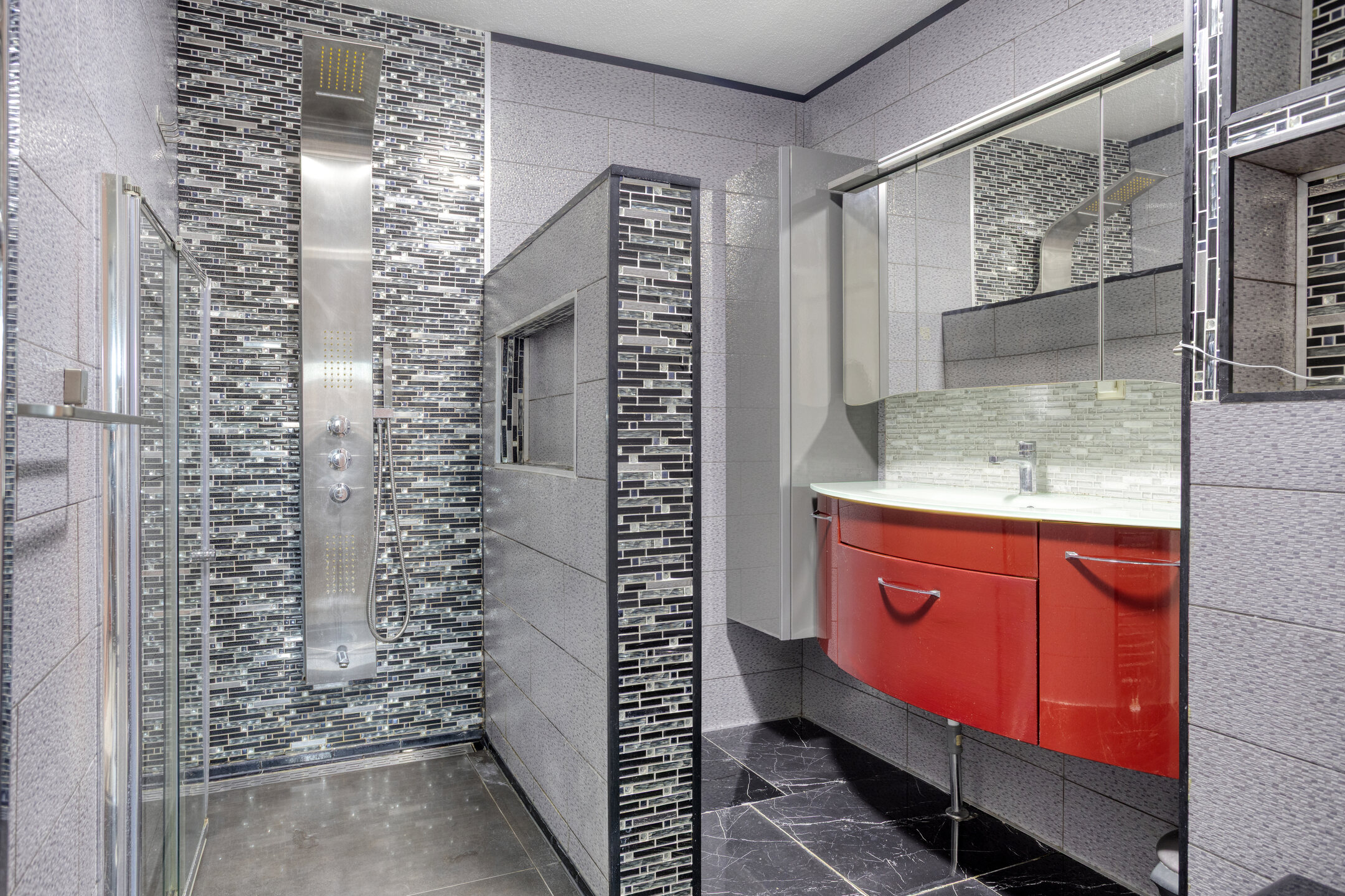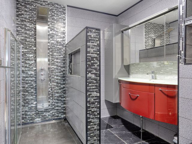 De liefhebbers badkamer met een rvs designradiator, is uitgerust met o.a. een wastafelmeubel, een handige inloopdouche en een stoer, zwart vrijhangend toilet.