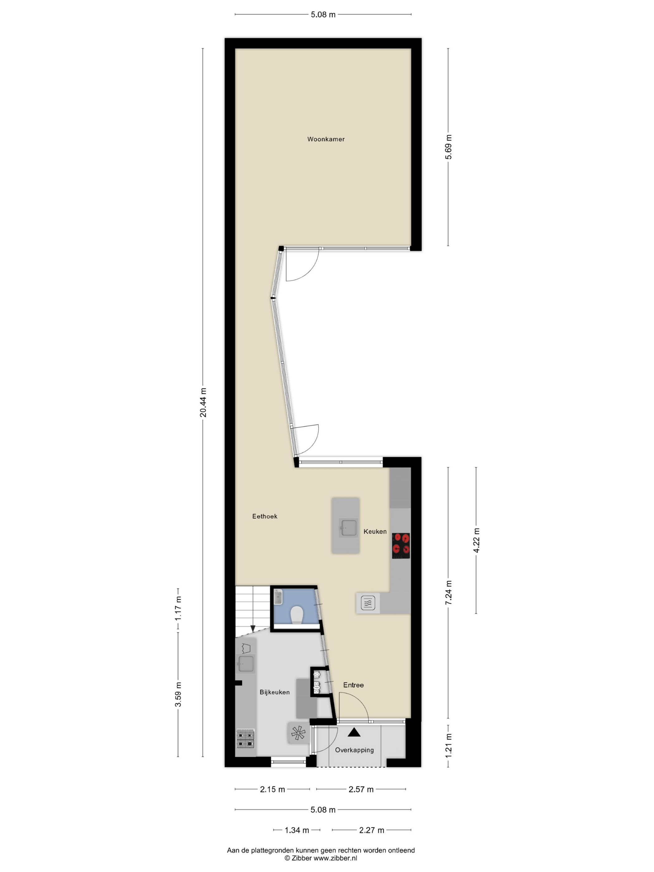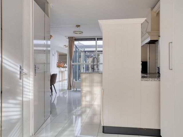 Via een overdekte entree is de hal bereikbaar. Vanuit de halfopen hal zijn de praktische bijkeuken, het vrijhangend toilet en de unieke woonkeuken toegankelijk. De praktische bijkeuken, heeft een hoog geplaatst raam, een loopdeur naar de voortuin en een 2e inbouwkeuken.