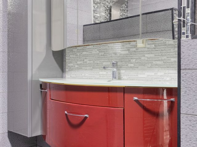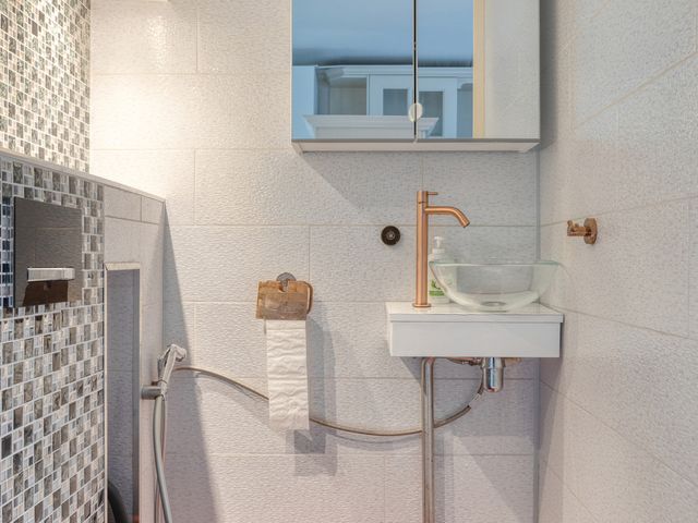 Deze nette inbouwkeuken is uitgerust met een rvs design afzuigkap, een 4-pits gaskomfoor met 1 wokbrander, een wasmachine-/drogeraansluiting. Het kleurrijke design toilet heeft een zwart vrijhangend toilet en een glazen waskom.