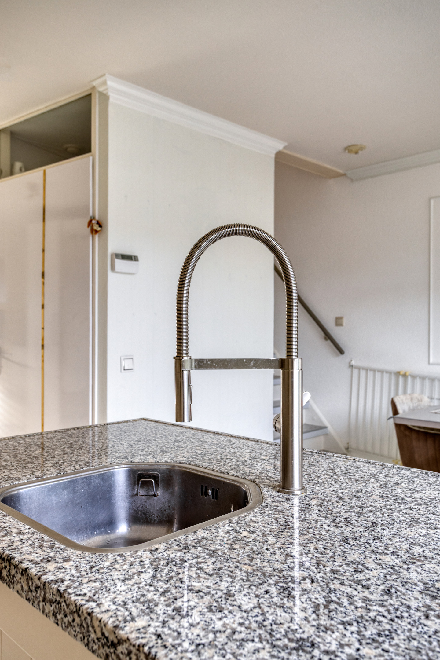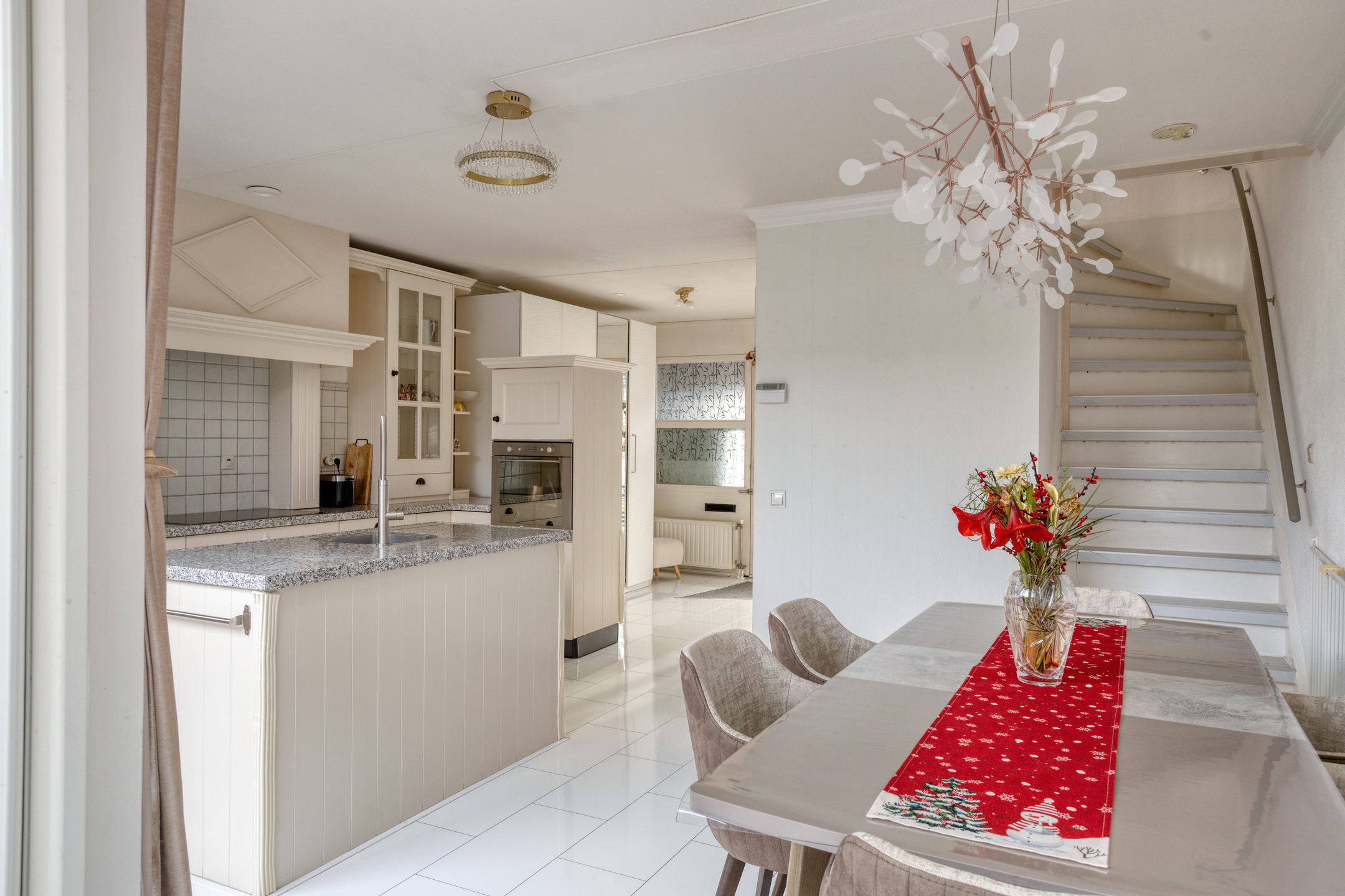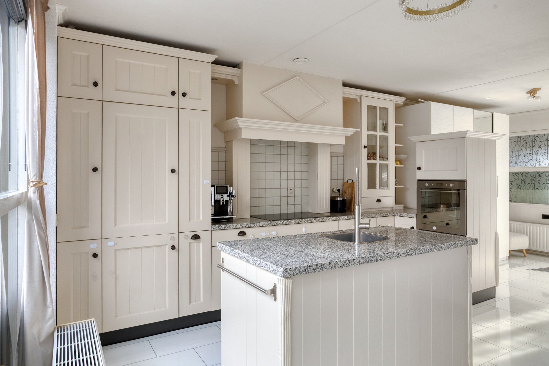 De verrassende woon-/leefkeuken heeft een spoeleiland, een glazenpui, een trapopgang naar de slaapverdieping, een speelse "doorkijk" naar de woonkamer en kijkt uit op de patiotuin. Deze lichte, complete "hoofd" inbouwkeuken met een duurzaam granieten aanrechtblad, is voorzien van een schouw met een afzuigkap, een inductiekookplaat (ca. 80 cm), een rvs oven, een vaatwasmachine, een koelkast en een diepvriezer. Middels de semi-open tussengang met een riante glazen pui is de royale woonkamer te bereiken.