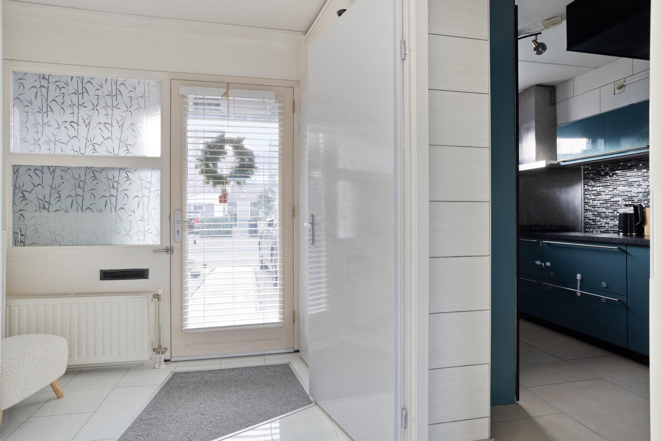 Indeling met een overdekte entree. Via de open hal zijn de praktische bijkeuken, het vrijhangend toilet en de unieke woonkeuken toegankelijk. Middels een semi-open gang met een schitterende glazen pui is de woonkamer te bereiken. Vanuit de semi-open tussengang en de woonkamer is de patiotuin bereikbaar.