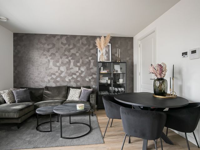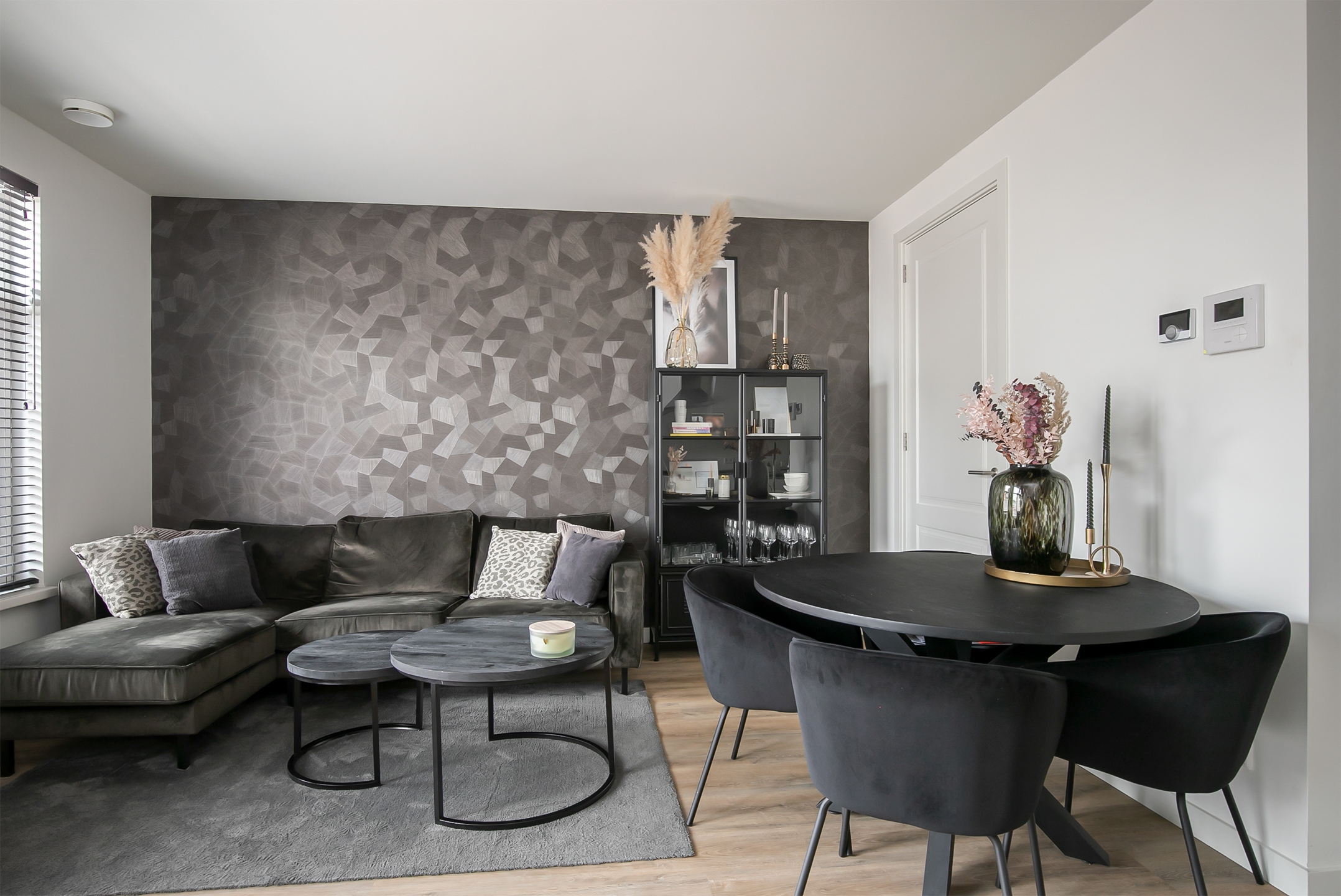 De lichte woonkamer is voorzien van een mooie pvc vloer en de wanden zijn deels strak gestuct en deels voorzien van behang.