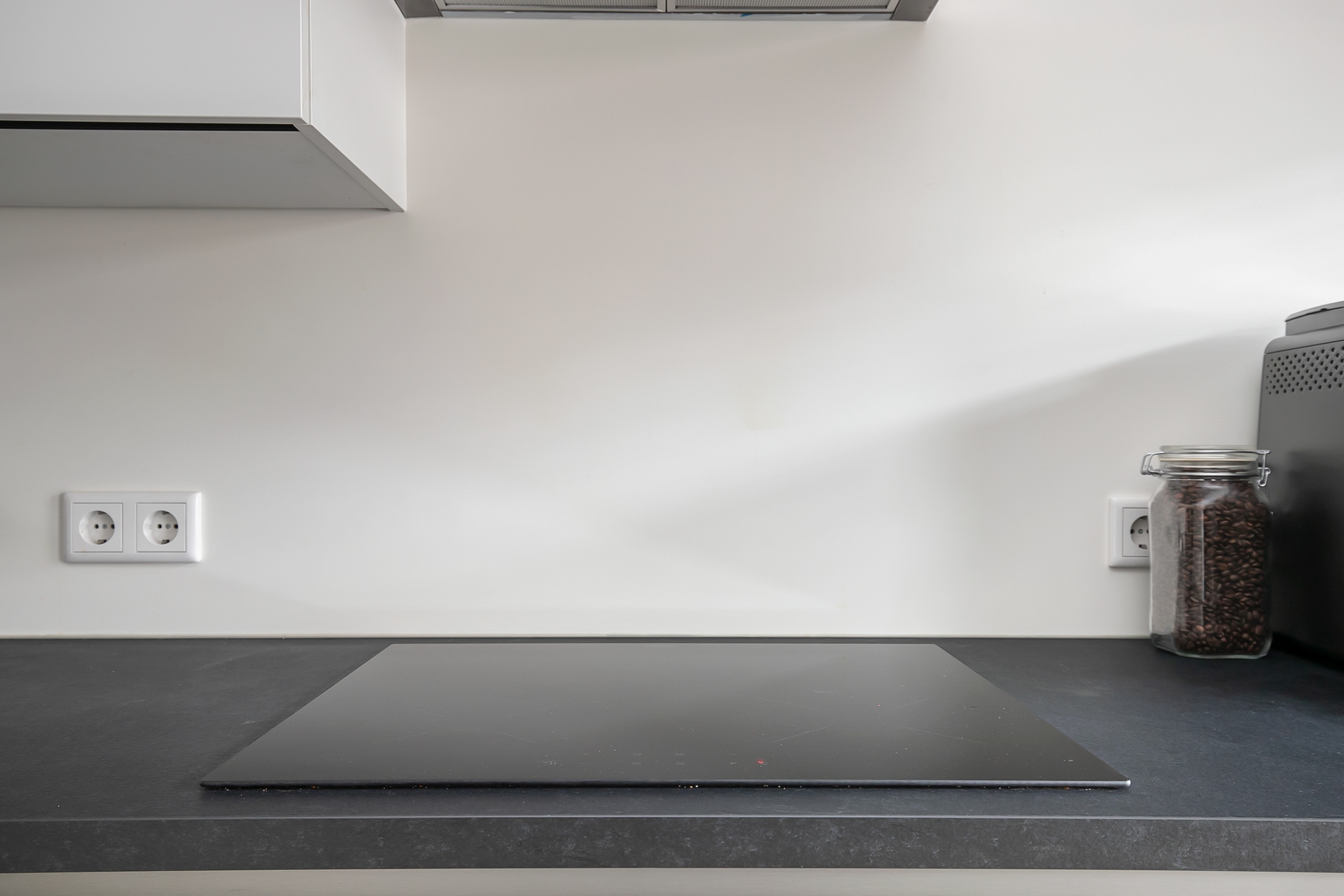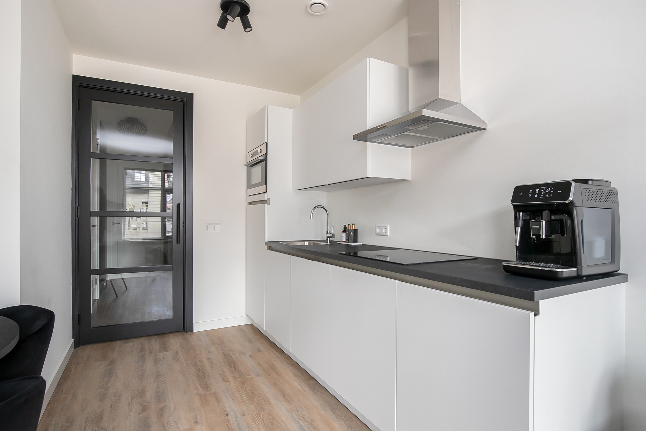 De luxe open keuken is voorzien van onder- en bovenkasten en is uitgerust met een inductiekookplaat, rvs afzuigkap, combi-oven, koelkast en vaatwasser.