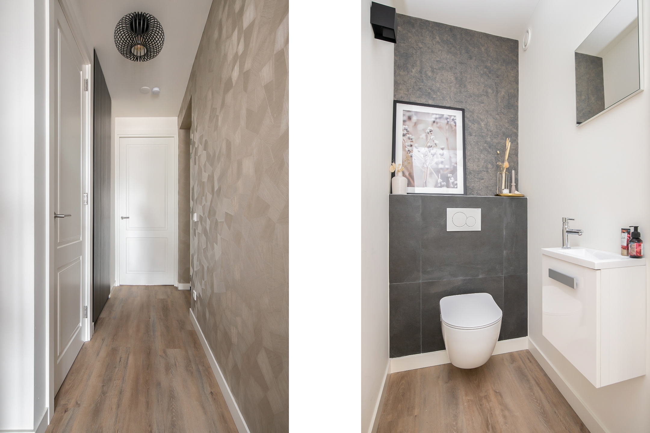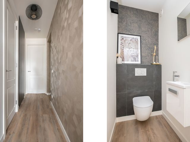 Bij binnenkomst in de hal ervaar je direct de prima afwerking van het appartement. De vloer is voorzien van een pvc vloer en de wanden zijn deels voorzien van behang en deels voorzien van strak stucwerk. Vanuit de hal is de woonkamer, het toilet, de slaapkamer en badkamer toegankelijk.
