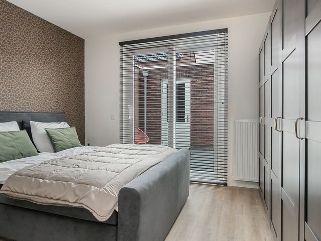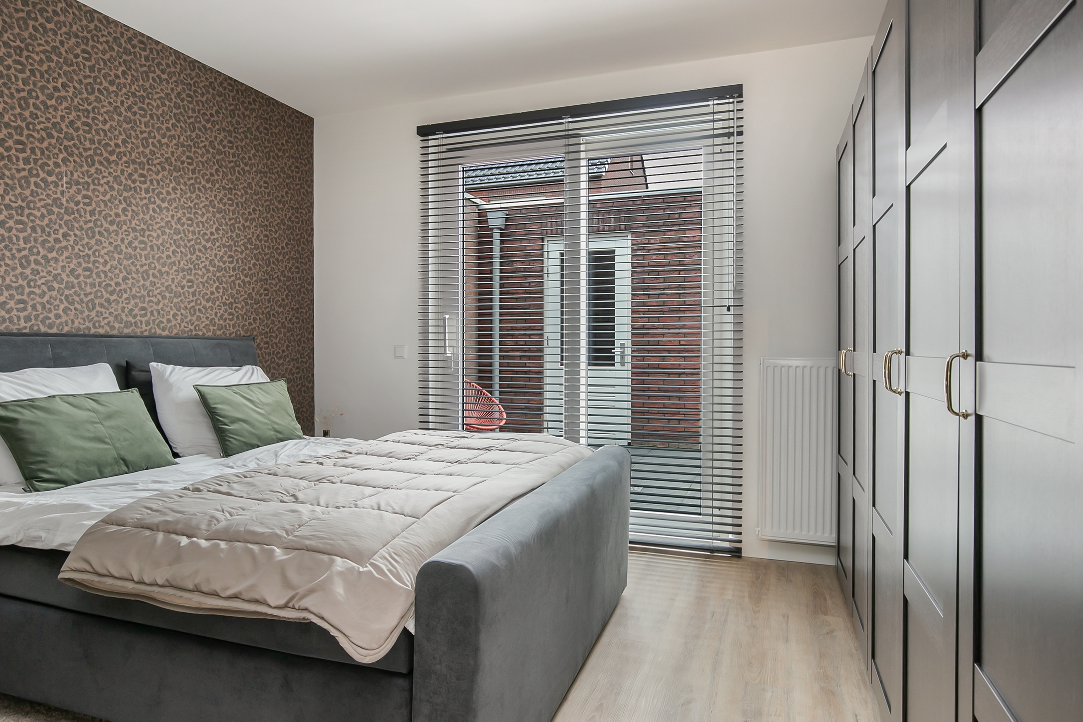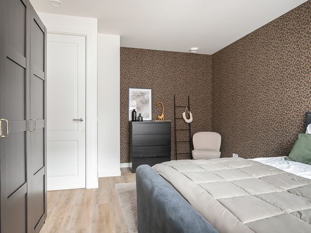 De slaapkamer is afgewerkt met een pvc vloer en de wanden zijn deels strak gestuct en deels voorzien van behang. Door de schuifpui is deze slaapkamer een fijne lichte ruimte.