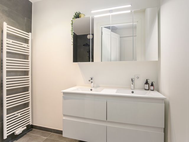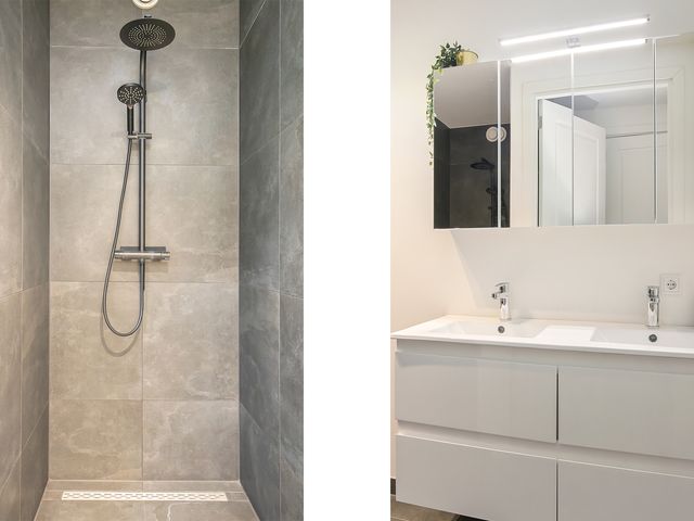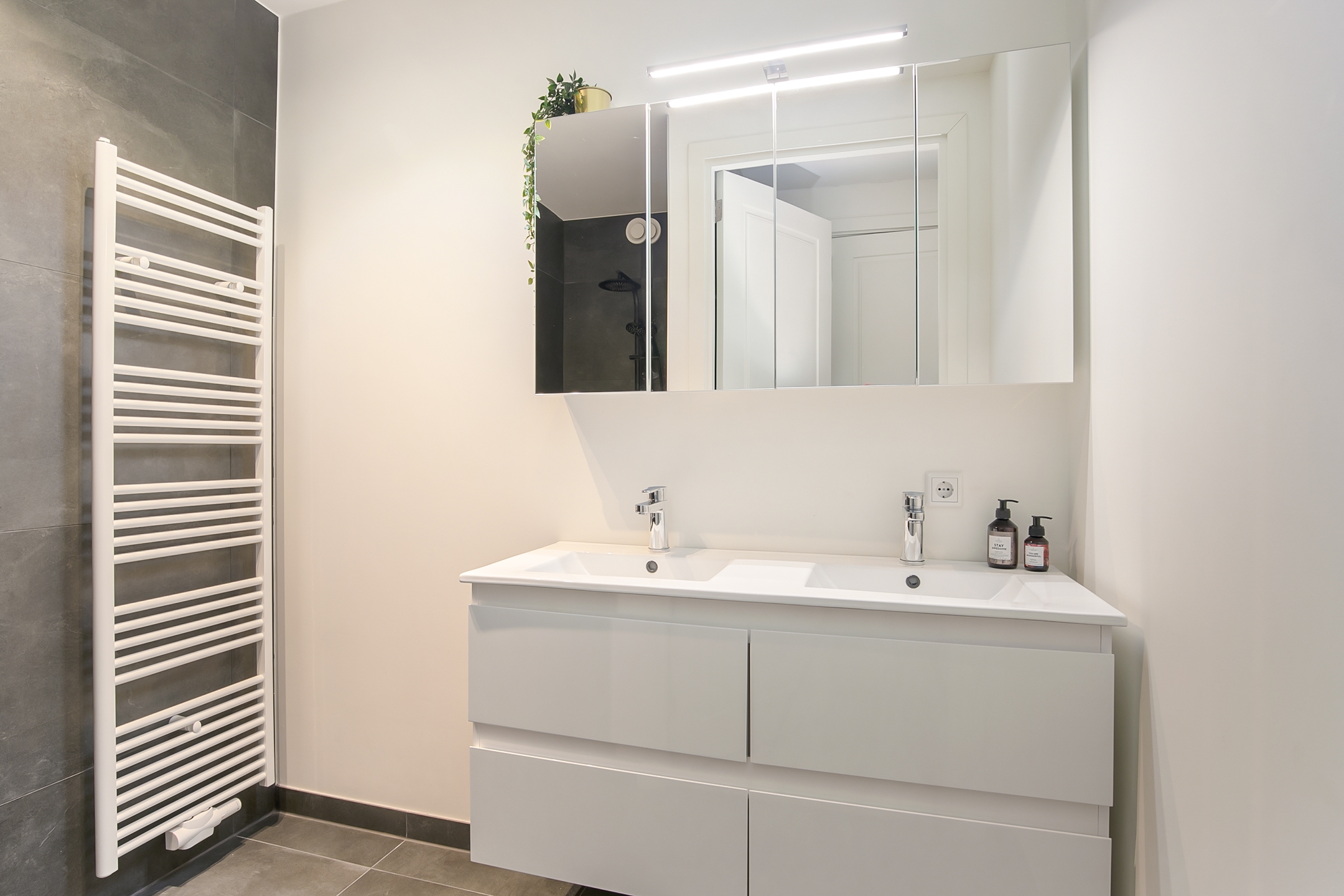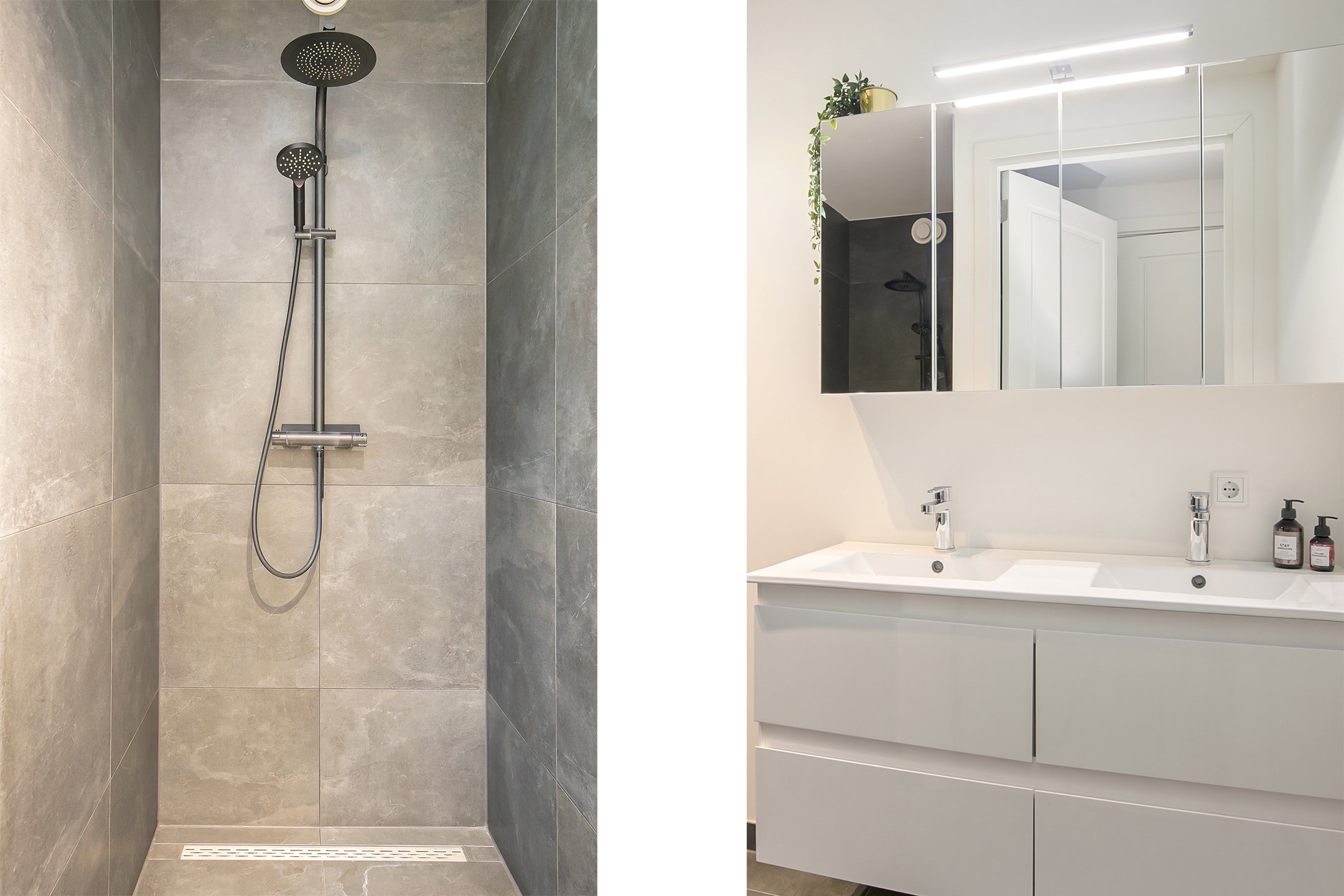 De moderne badkamer is voorzien van een inloopdouche en een dubbele wastafel in een badkamermeubel en een spiegelkast.